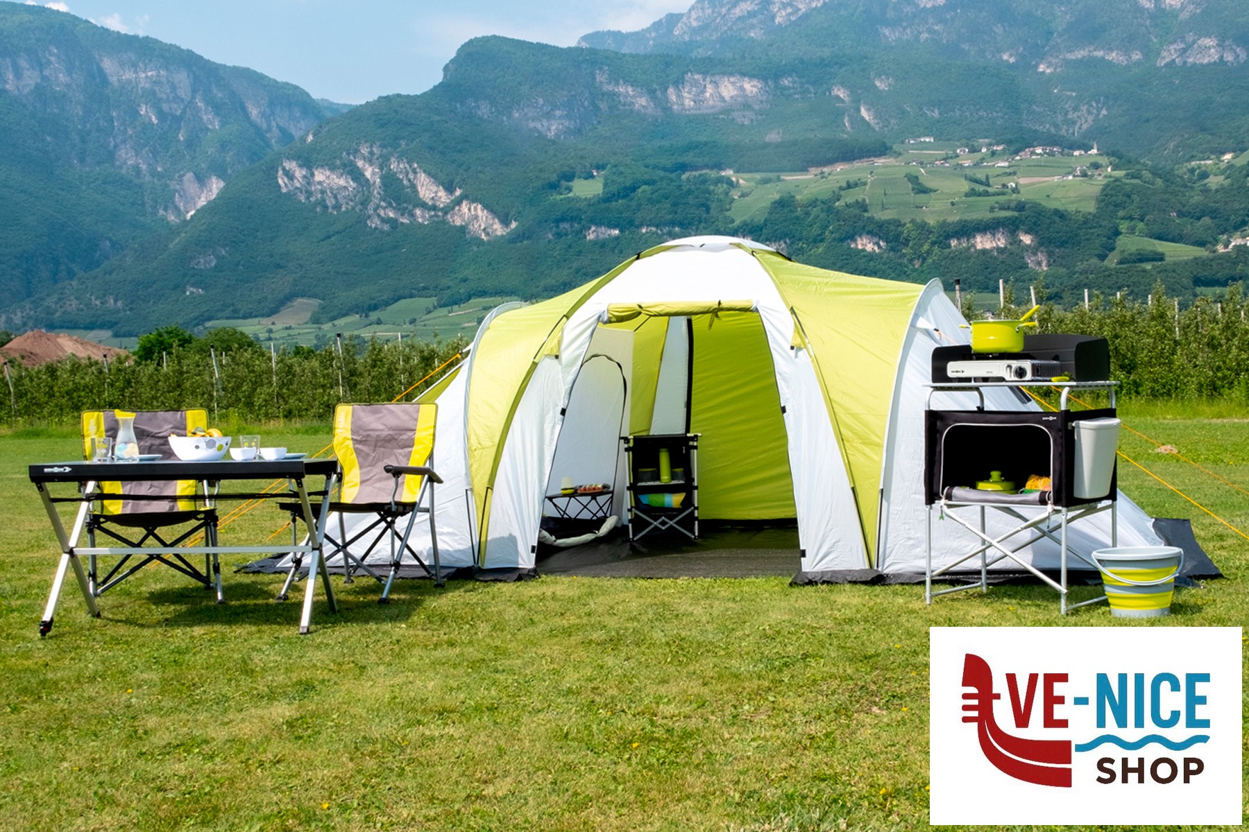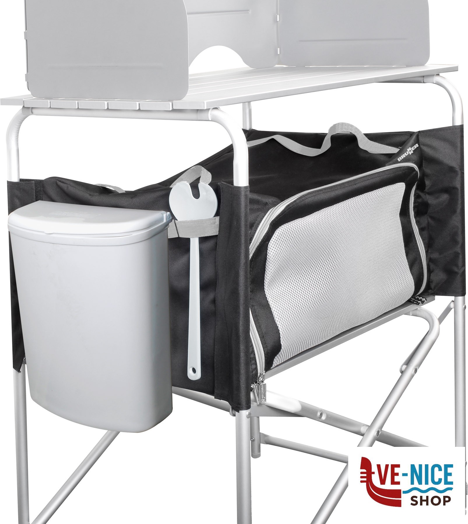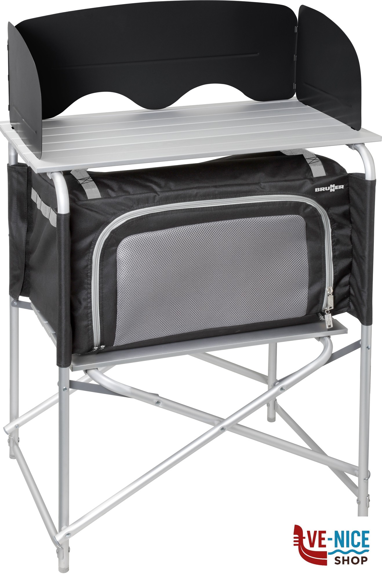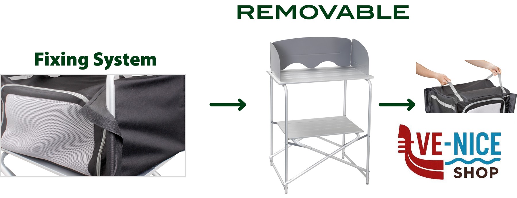 Mobiletto cucina da campeggio pieghevole con piano di lavoro arrotolabile, ripiano inferiore con armadio in tessuto rimovibile e utile paravento e paraspruzzi. Un piedino è regolabile in altezza. Veloce e facile da montare e smontare. Molto compatto quando chiuso e quindi facile da riporre. Completo di robusta borsa per il trasporto.