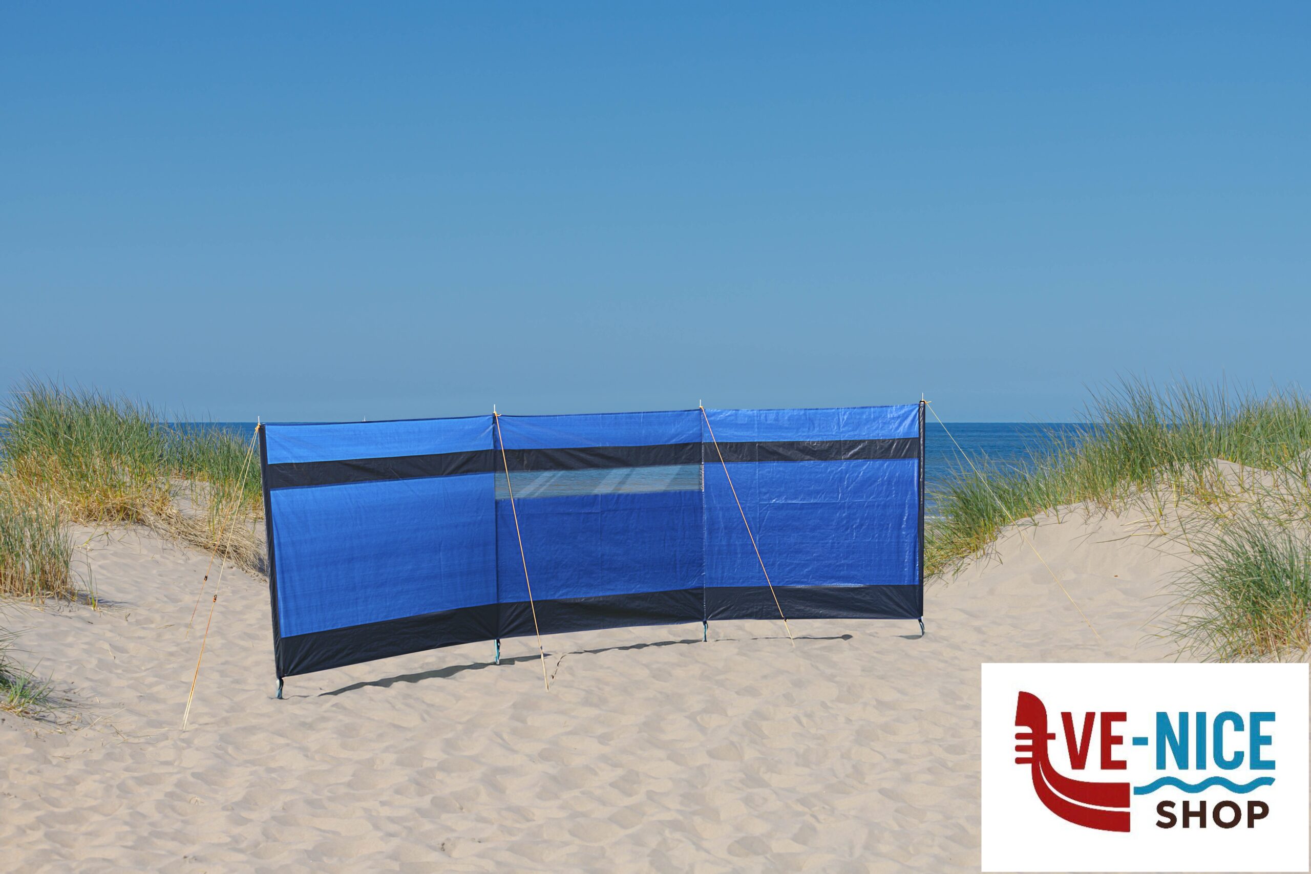 Windbreak with built-in plastic window. Features joinable steel poles and fittings. Height: 140 cm.