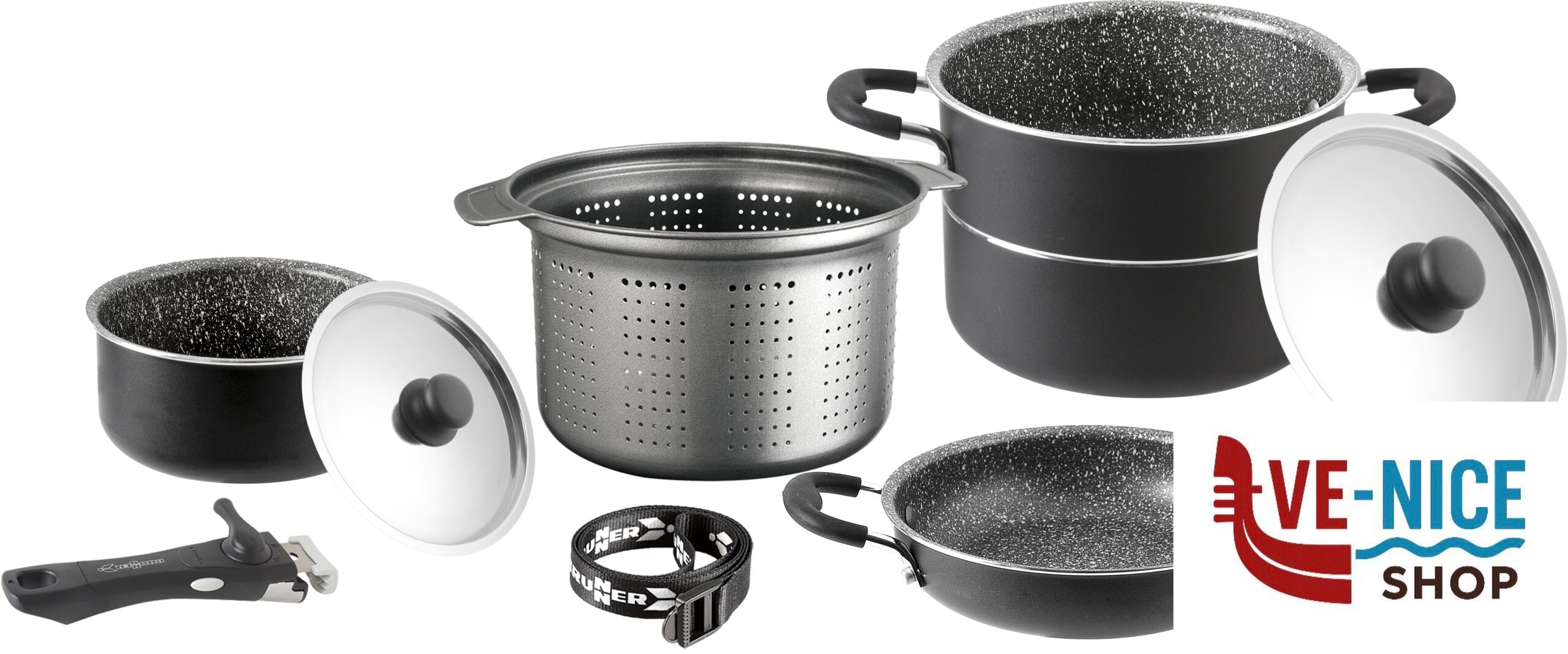 Casseruola media~Ø 18 cm – 2 l!!!Cinghia~1X!!!Coperchio grande~Ø 22 cm!!!Coperchio medio~Ø 18 cm!!!Padella con manici~Ø 22 cm – 1,8 l!!!Pentola grande~Ø 22 cm – 5,3 l!!!Peso~3,18 kg!!!Pinza grip~1X!!!Scolapasta pastaiola~Ø 22 cm