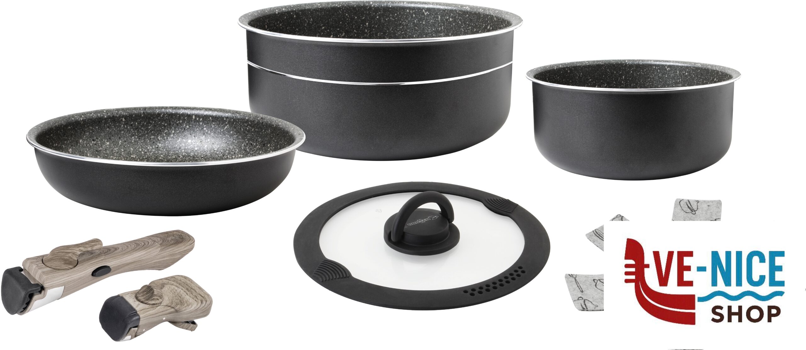 Casseruola media~Ø 24 cm – H10 cm!!!Casseruola piccola~Ø 20 cm – H9 cm!!!Coperchio grande~Ø 24 cm!!!Padella senza manici~Ø 24 cm – H5 cm!!!Peso~2,70 kg!!!Pinza grip~1X!!!Pinza grip~2X