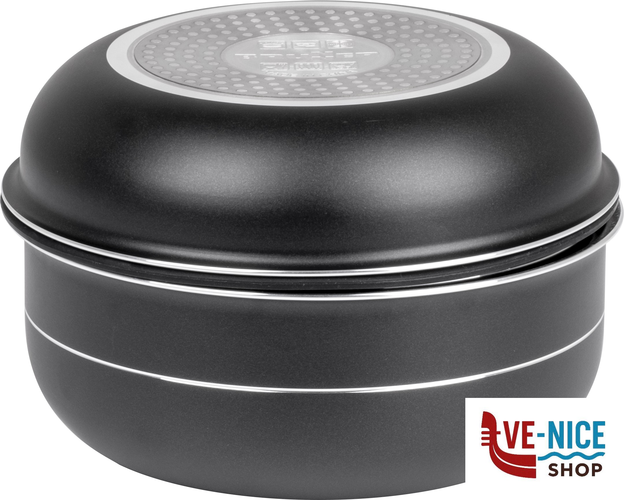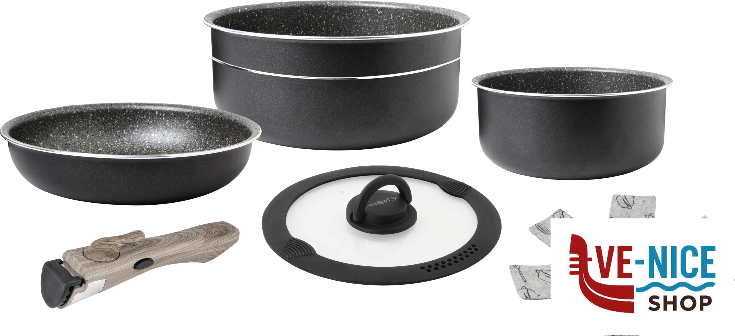 Casseruola media~Ø 22 cm – H10 cm!!!Casseruola piccola~Ø 18 cm – H9 cm!!!Coperchio grande~Ø 22 cm!!!Padella senza manici~Ø 22 cm – H5 cm!!!Peso~2,40 kg!!!Pinza grip~1X
