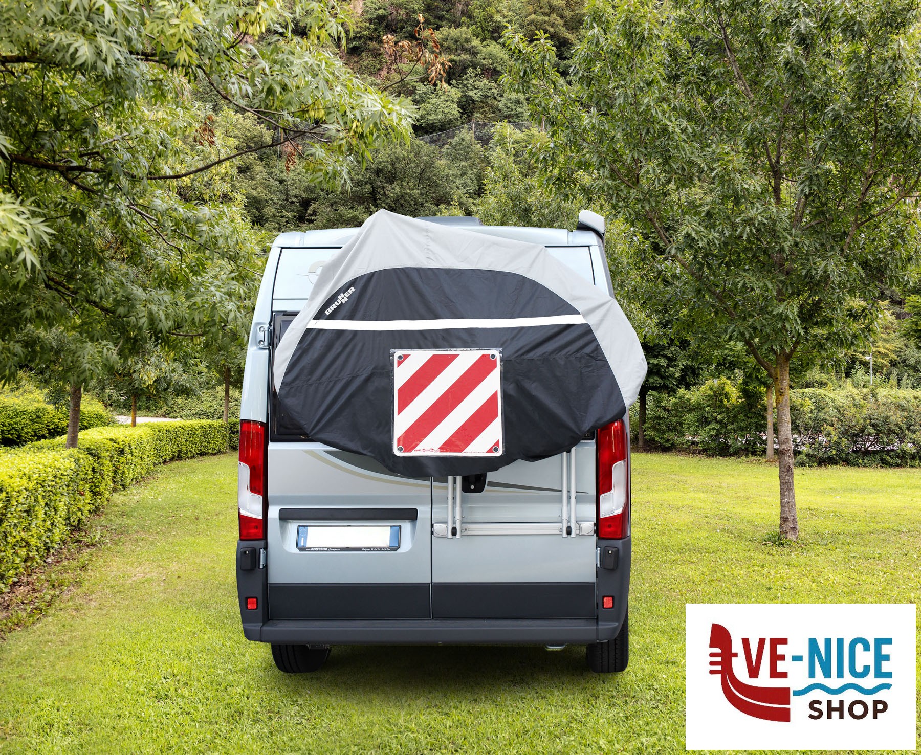 Copribicicletta in resistente tessuto di poliestere con spalmatura idrorepellente. Dotato di speciale tasca per la sistemazione del cartello carichi sporgenti.