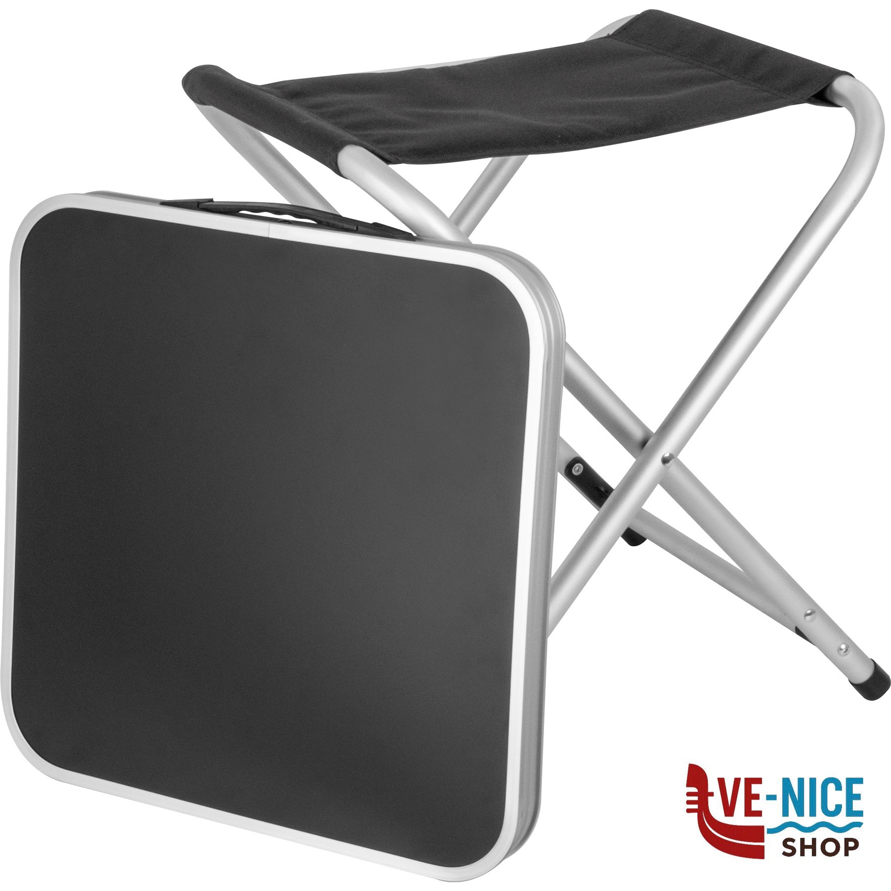 Practical set consisting of a lightweight folding aluminium stool with polyester seat cover and a sturdy table top. Comes with carry bag.