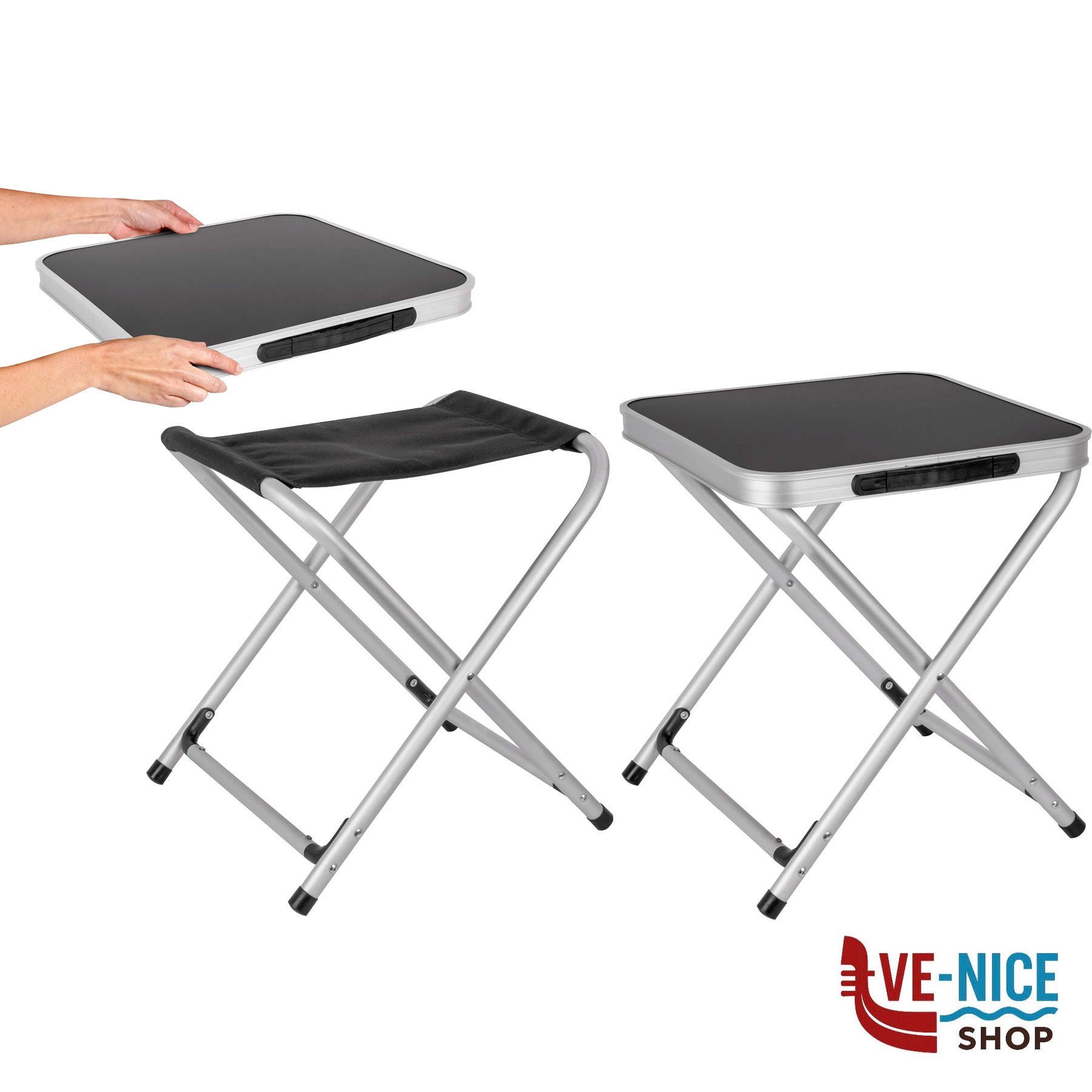 Pratico set composto da un leggero sgabello pieghevole in alluminio con seduta in poliestere e robusto piano del tavolo. Viene fornito con borsa di trasporto.