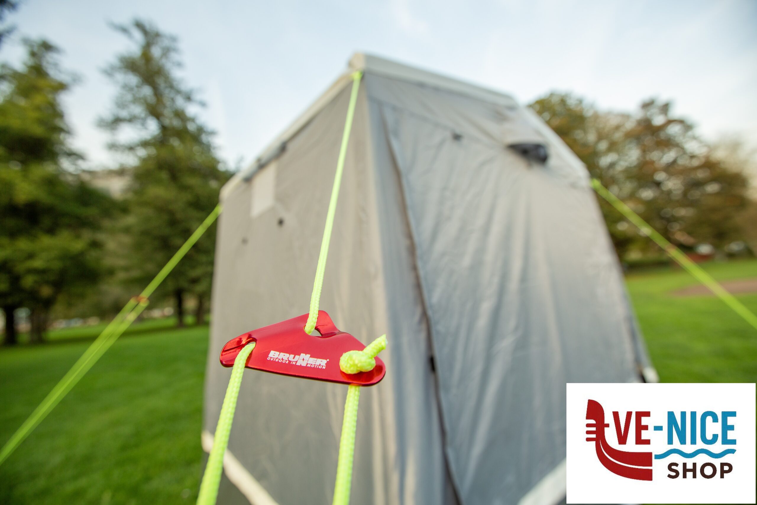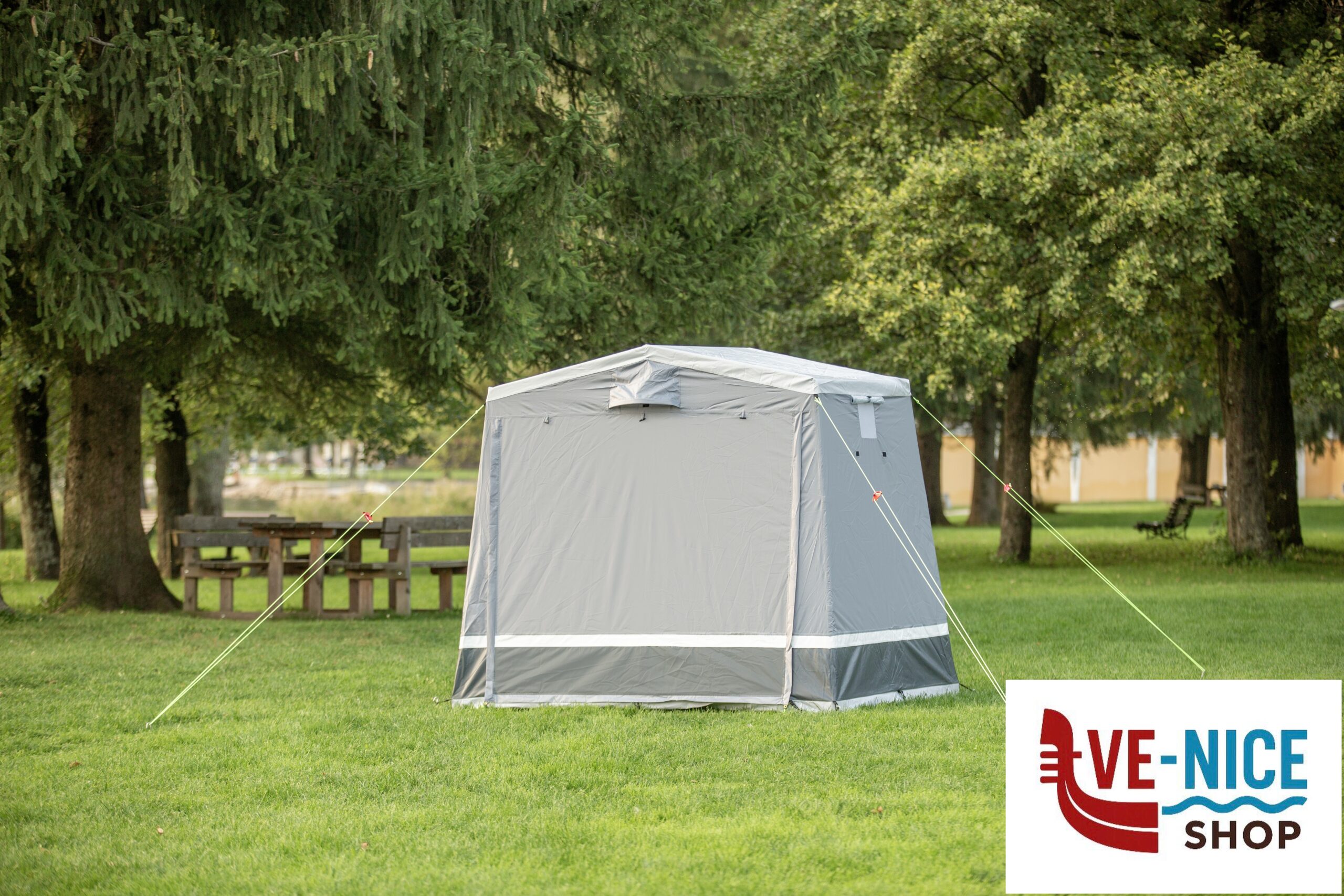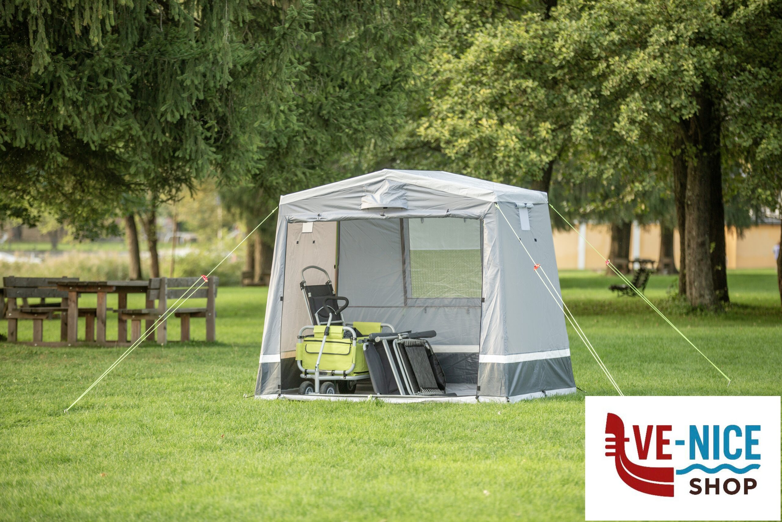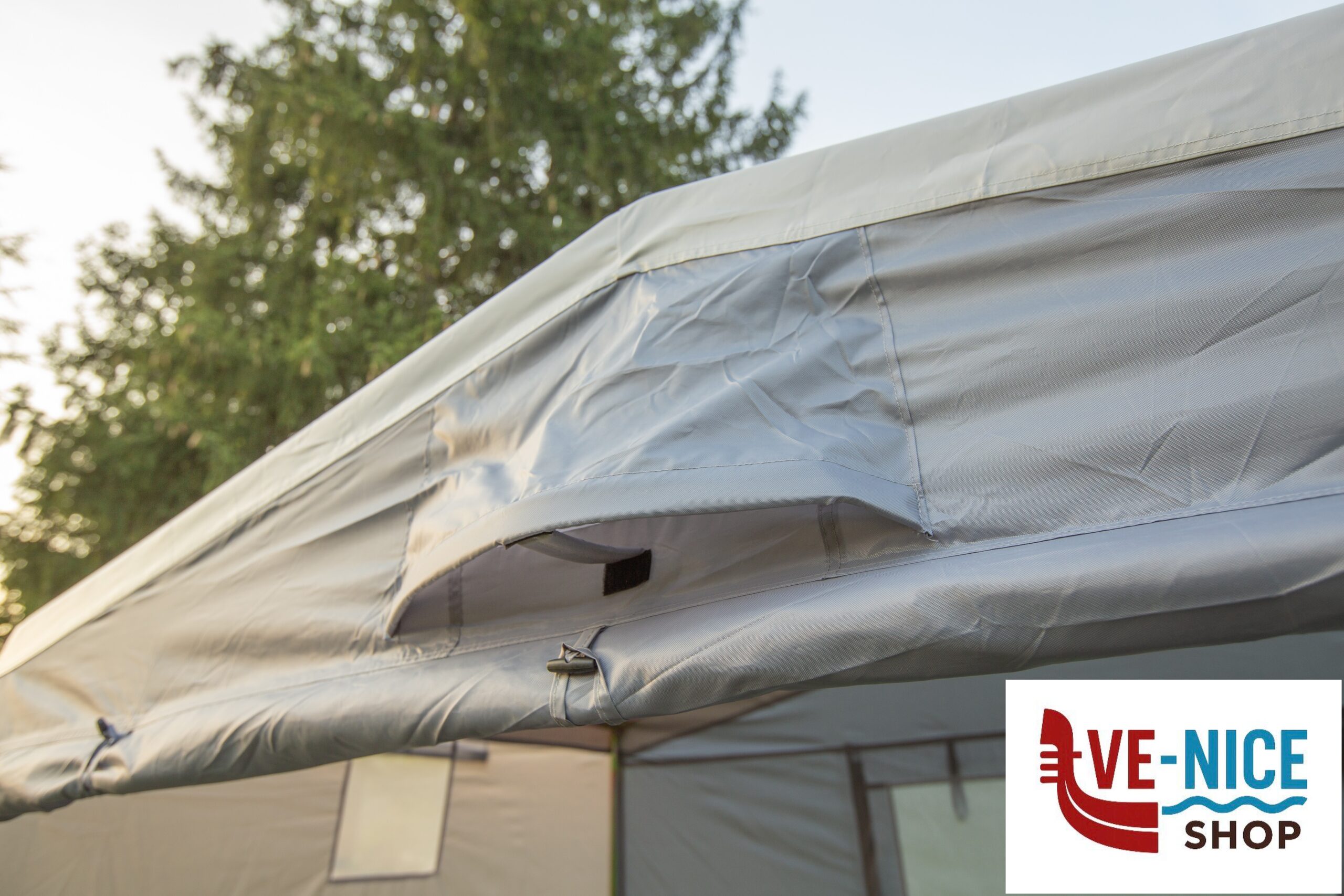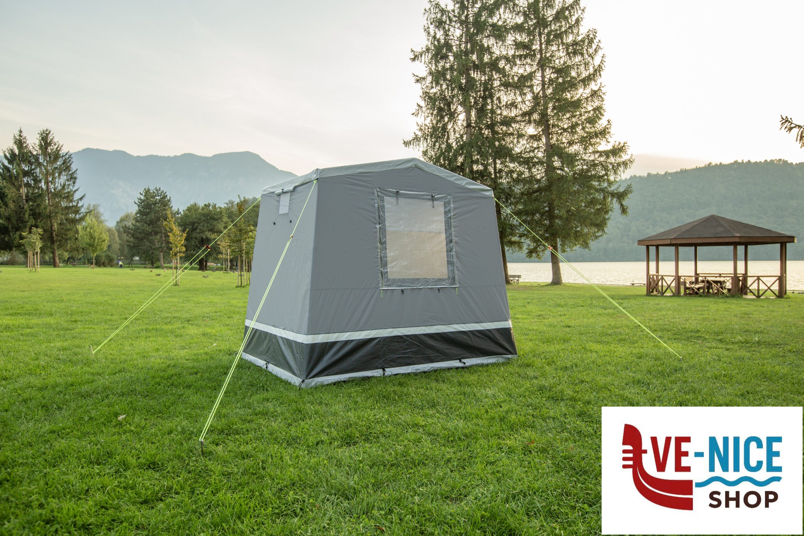 Practical storage tent with saddle roof for the well-equipped camper. Robustly designed with firmly sewn-in groundsheet. The large entrance door at the front can be conveniently opened by means of two zips and can be opened out as a sun canopy if required. The rear wall has a large mesh window that can be closed with an embossed foil. 3 ventilation openings on the front and side walls ensure sufficient air circulation inside the tent. Mounting material included.