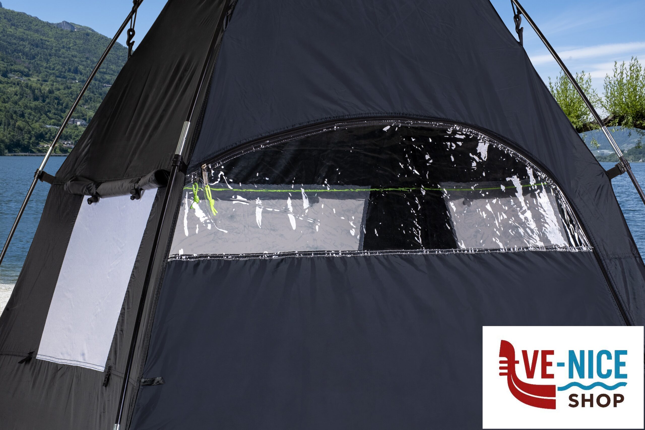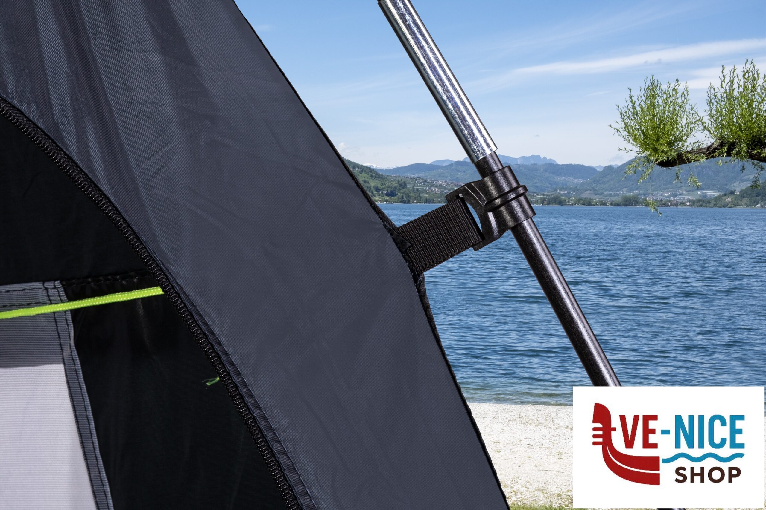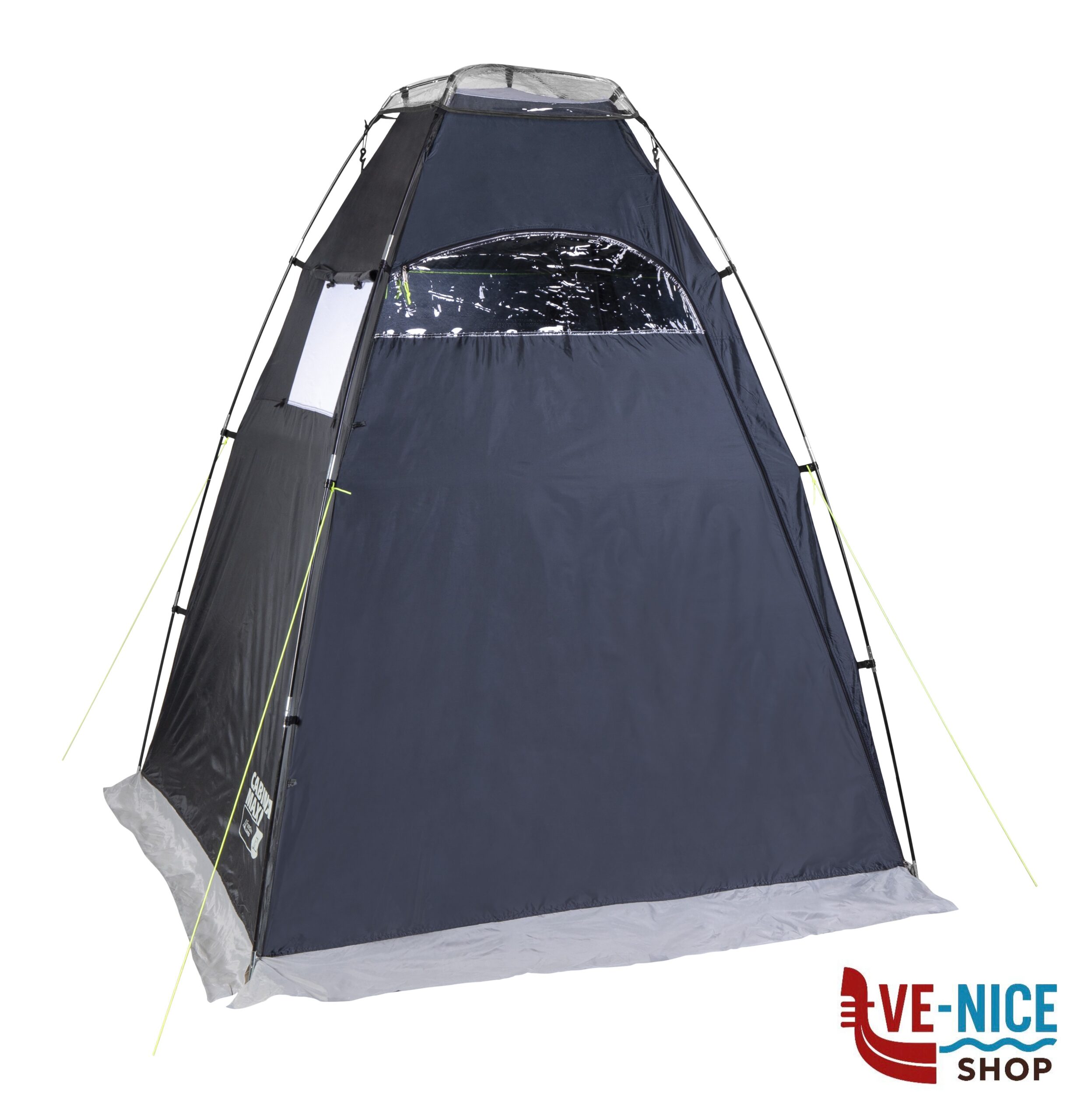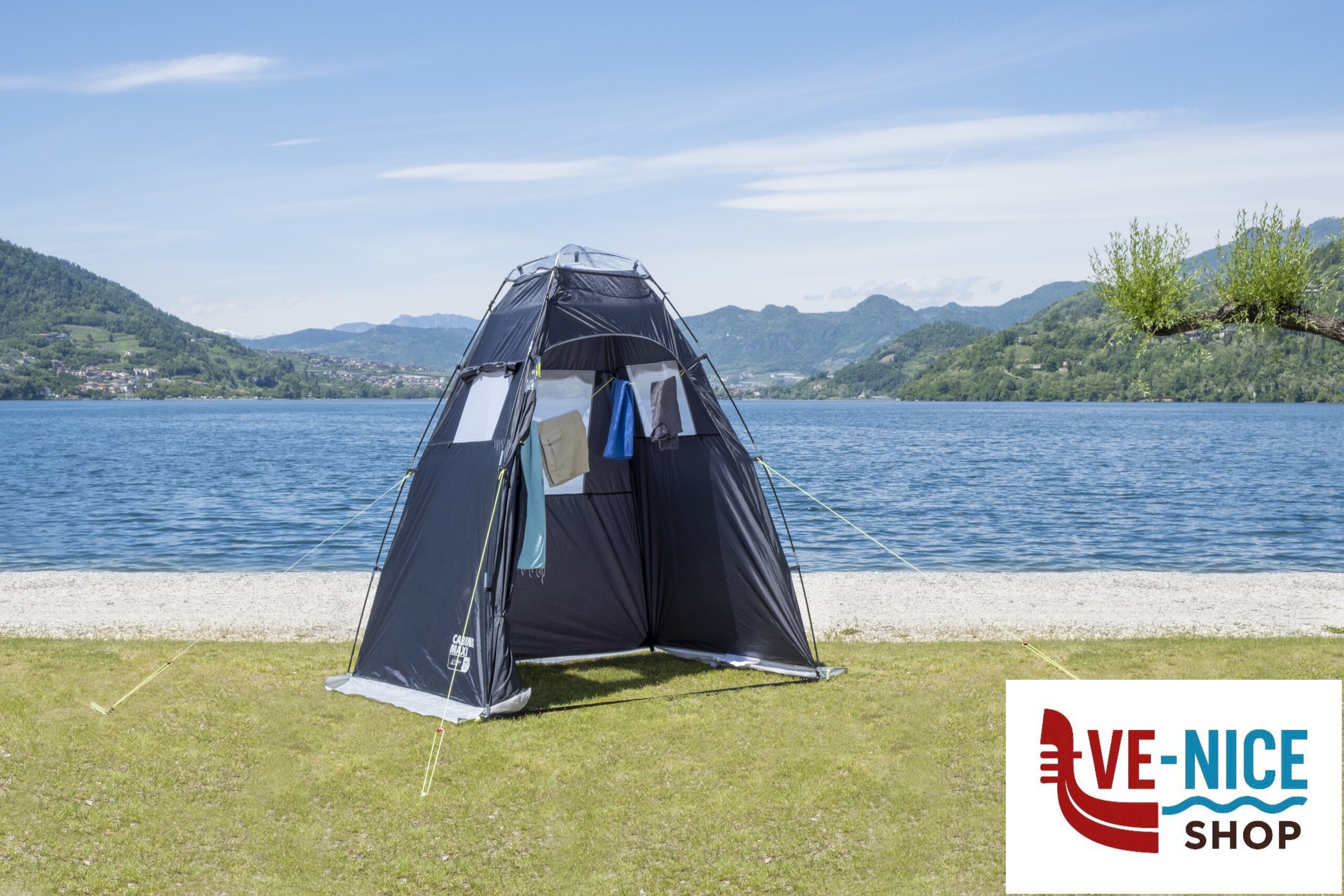 Pratica tenda cabina per campeggio e spiaggia. Ideale per la doccia e cambiarsi, ma grazie al suo sistema di aerazione anche come tenda cucina. Montaggio semplice. Porta con cerniera e balza perimetrale. Ampie dimensioni interne. Imballo compatto. Con sacca custodia ed accessori di montaggio.