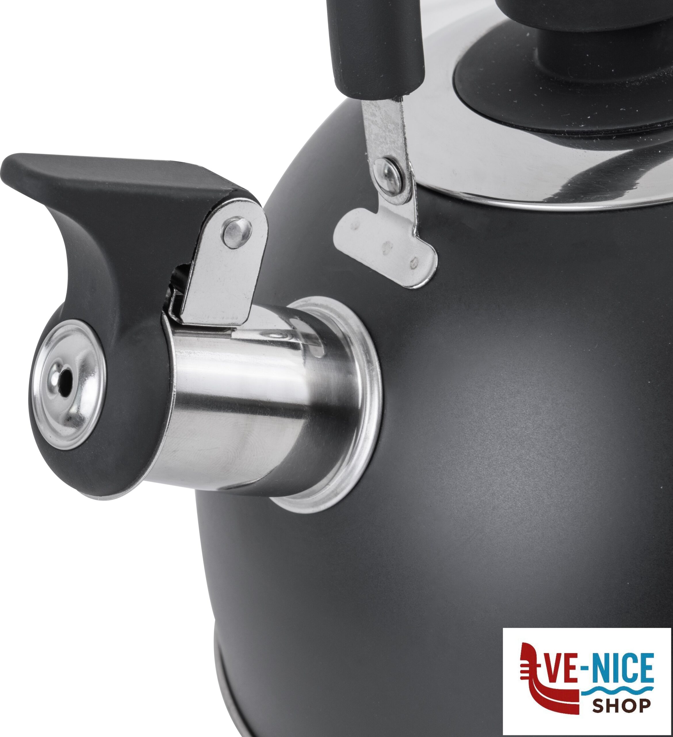 Water kettle, identical in construction to the Dayo model, but with induction-suitable bottom and non-slip rubberized handles. Elegant design.