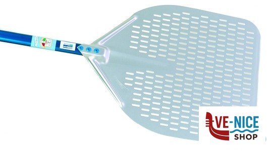 PALA CON TESTA IN ALLUMINIO ANODIZZATA NEUTRA E MANICO ANODIZZATO AZZURRO. PRESENTA UN PESO RIDOTTO RISPETTO AI MODELLI CLASSICI MA UNA ROBUSTEZZA ESTREMA CON IL MANICO IN TUBOLARE OVALE PER FAVORIRE STABILIT. LA TESTA LEGGERA E FLESSIBILE CONSENTE L’EFFETTO SPATOLA CON APPOSITE NERVATURE CHE ASSICURANO LA TENUTA; L’ ANODIZAZIONE NEUTRA RENDE LA SUPERFICIE UNIFORME E LA PROTEGGE DALL’OSSIDAZIONE; LA FRESATURA DOLCE E REGOLARE FACILITA LA SALITA DELLA PIZZA. LA GIUNZIONE TESTA MANICO COSTITUITA DALLA SOVRAPPOSIZIONE DEI DUE ELEMENTI ASSICURATA DA TRE GRANDI RIVETTI IN LINEA CHE GARANTISCONO SICUREZZA E INAMOVIBILIT, INOLTRE L’ASSENZA DI VIBRAZIONI TRASMESSE AL MANICO CONFERISCE UN MAGGIOR COMFORT D’USO. L’ASOLATURA CONFERISCE BASSO ATTRITO E SCARICA LA FARINA EVITANDO CHE SI ATTACCHI SUL FONDO DELLA PIZZA RISCHIANDO DI BRUCIARE.