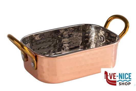 MINI CASSERUOLA IN ACCIAIO INOX CON COPERTURA MARTELLATA COLOR RAME E MANIGLIE DORATE, IDEALE PER SERVIRE STUZZICHINI, APERITIVI E MONOPORZIONI, GLI ARTICOLI SONO LAVABILI IN LAVASTOVIGLIE MA DA ASCIUGARE CON CURA.