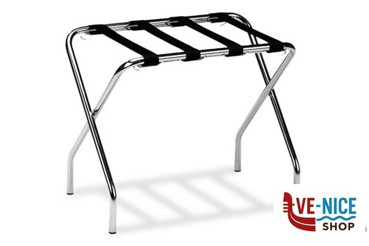 PORTAVALIGIE CON STRUTTURA PIEGHEVOLE IN TUBO DI ACCIAIO CROMATO SENZA SPONDA, LE CINGHIE SONO SMONTABILI IN PVC DI COLORE NERO, CON PIEDINI IN GOMMA PER UNA MAGGIORE STABILITA’