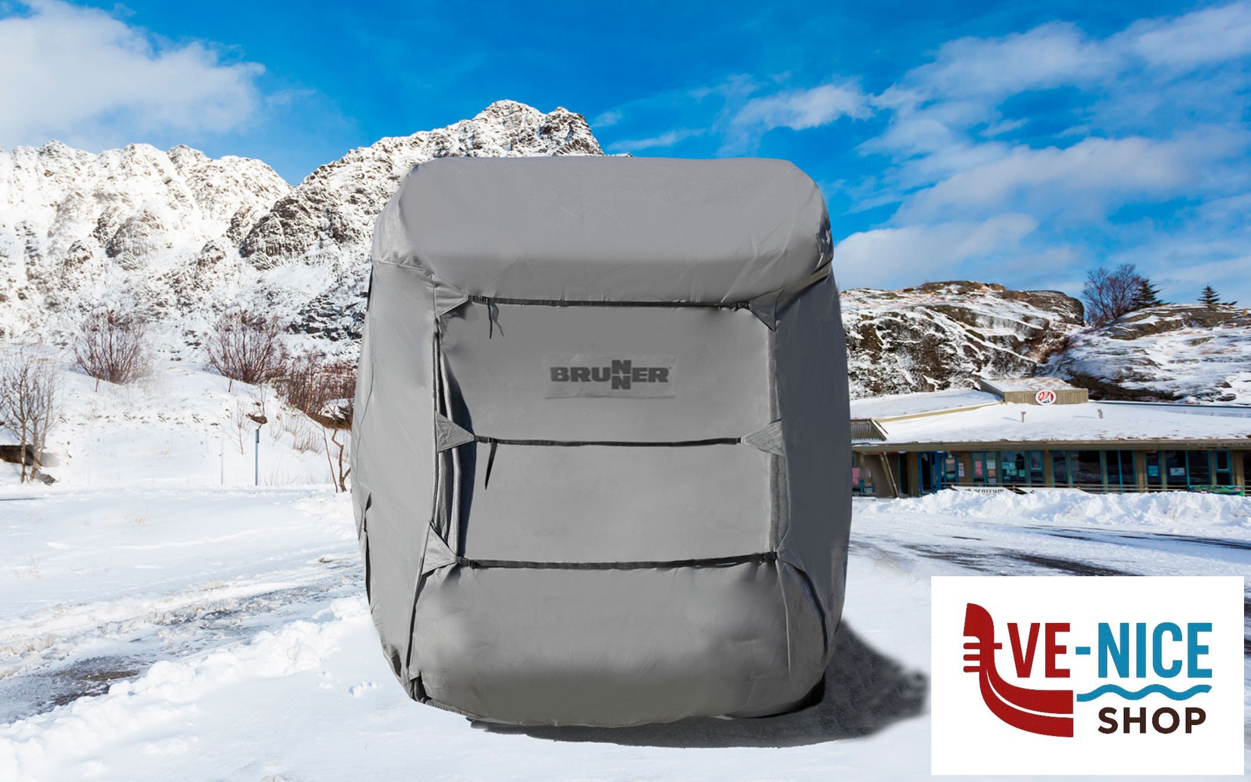 Protection cover for alcove motorhomes. Wider and higher than the caravan version. Made from breathable TNT (nonwoven) fabric. UV-stable, water-repellent and washable. Comes with a practical storage bag.