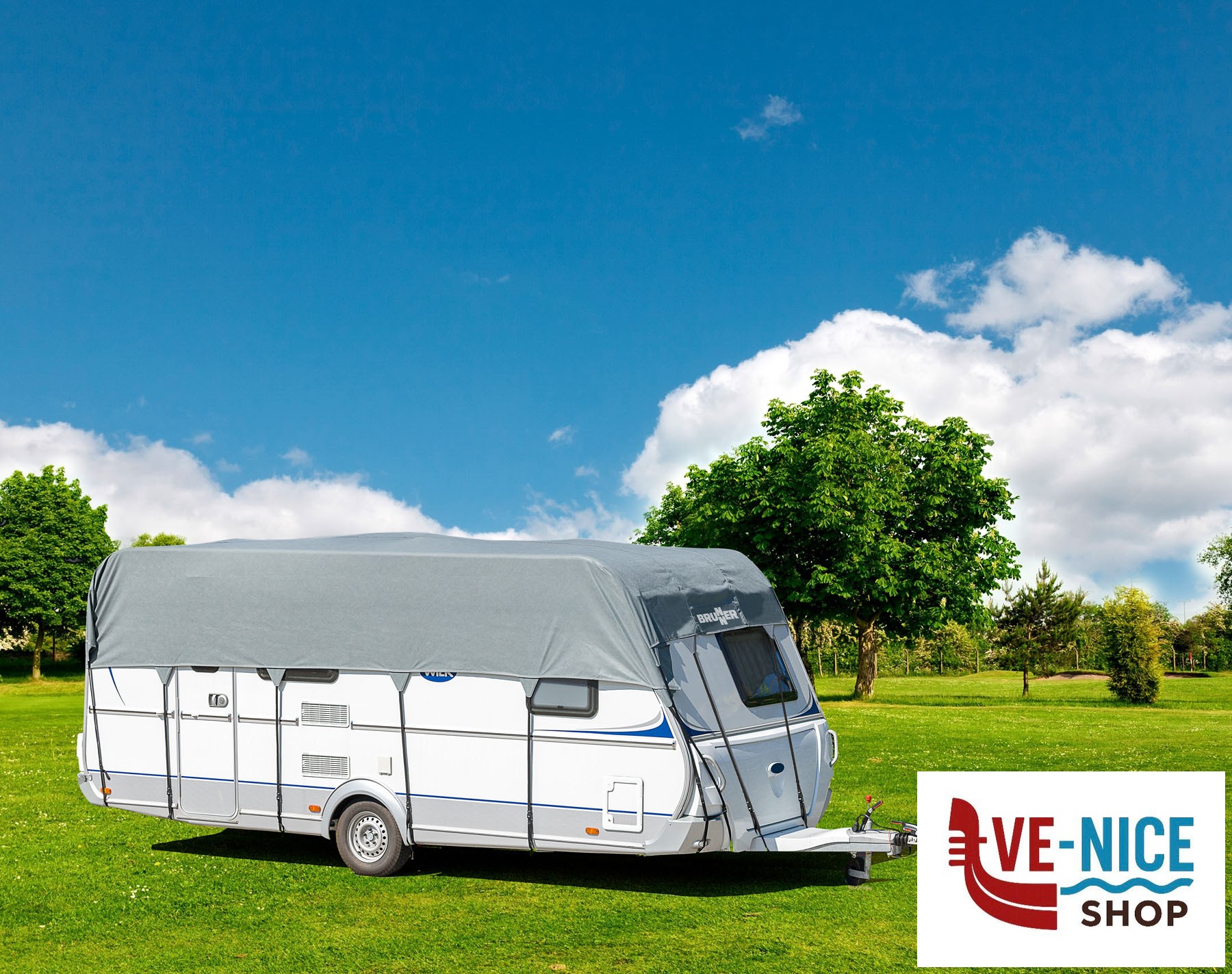 Functional roof cover for caravans. Made of breathable yet water repellent, 4-ply TNT-fiber fabric. Featuring a handy storage bag.