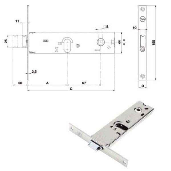 Serratura fasce alluminio infilare Acciaio zincato – Frontale inox – Senza incontro Scrocco catenaccio incorporato reversibile 2 mandate – Quadro maniglia mm 8 Entrata mm 70 – Cilindro non incluso Scatola C mm 175×44 – Frontale mm 16×155