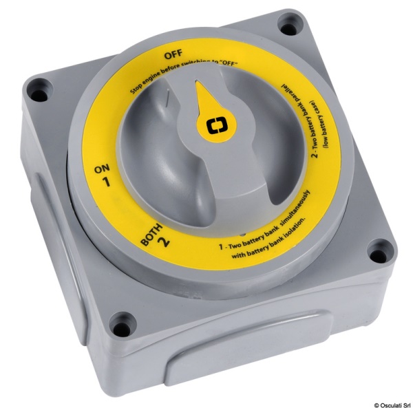 Materiale elettrico Deviatori batteria e ripartitori di carica Interruttore/deviatore per batterie Selecta New Permette di usare separatamente o assieme le batterie. Contatti in rame , molle inox , carcassa in PC / PTB / Fiberglass , resistente alla fiamma. Fondello di protezione per i cavi. Ghiera supplementare per montaggio ad incasso (foro Ø mm 95). Specifiche: ISO 8846 MARINE EN 28846. A) Versione MK II. Opzioni selezionabili: banco/batteria “1”, banco/batteria “2” oppure bancate 1+2 simultaneamente. Completo di dispositivo che disconnette automaticamente l’alternatore se viene attivata la funzione “OFF” senza aver spento i motori. Numero di omologazione: DIP006907SP. B) Versione “MK III”. Collega contemporaneamente in posizione “1” le batterie avviamento con i motori e le batterie servizi con gli stessi, mantenendo le batterie avviamento separate, minimizzando i rischi di scarica accidentale delle stesse. In caso d’emergenza. In posizione “2” i due circuiti vengono collegati tra loro (in parallelo). Numero di omologazione: DIP006907SP.