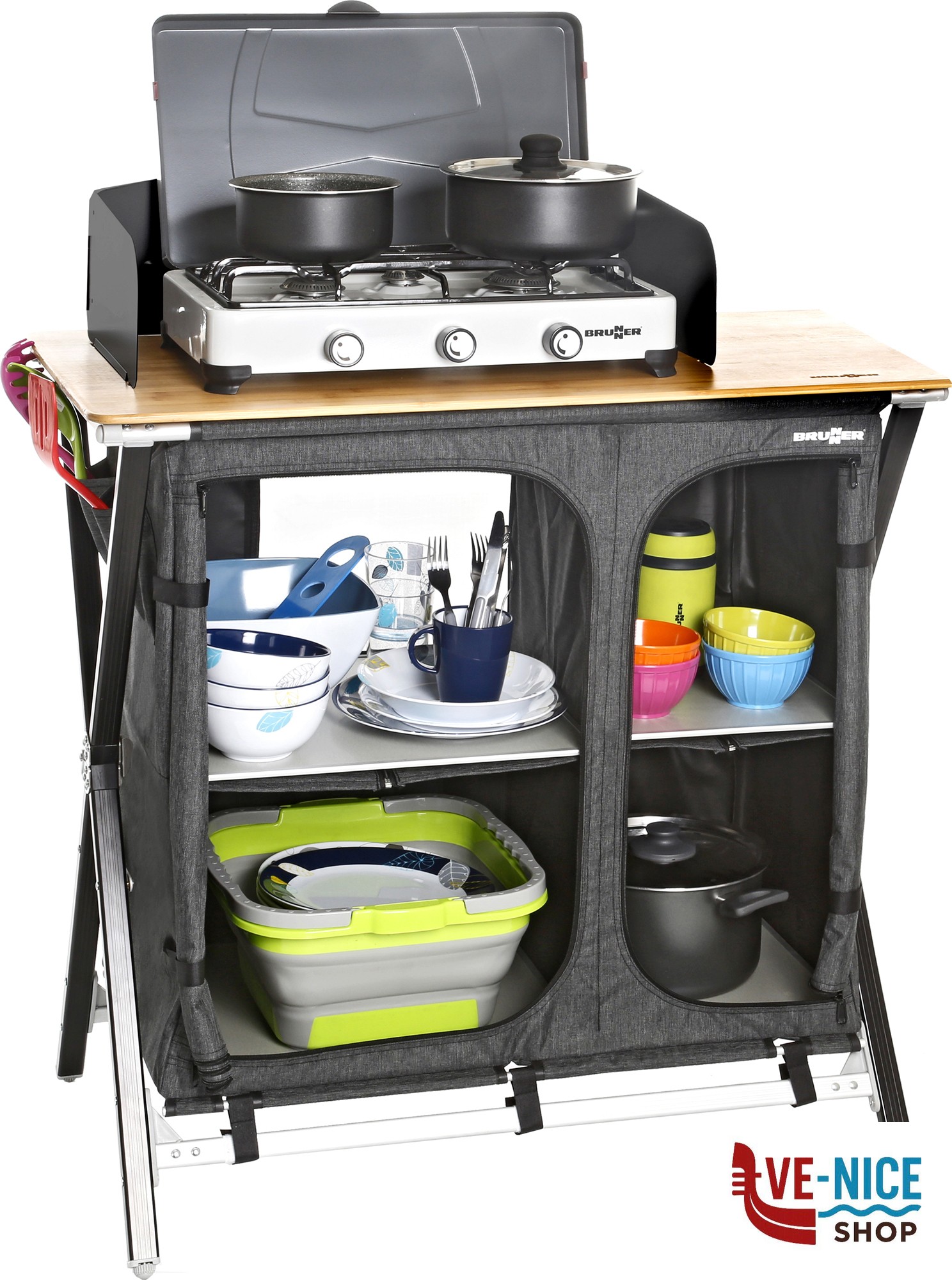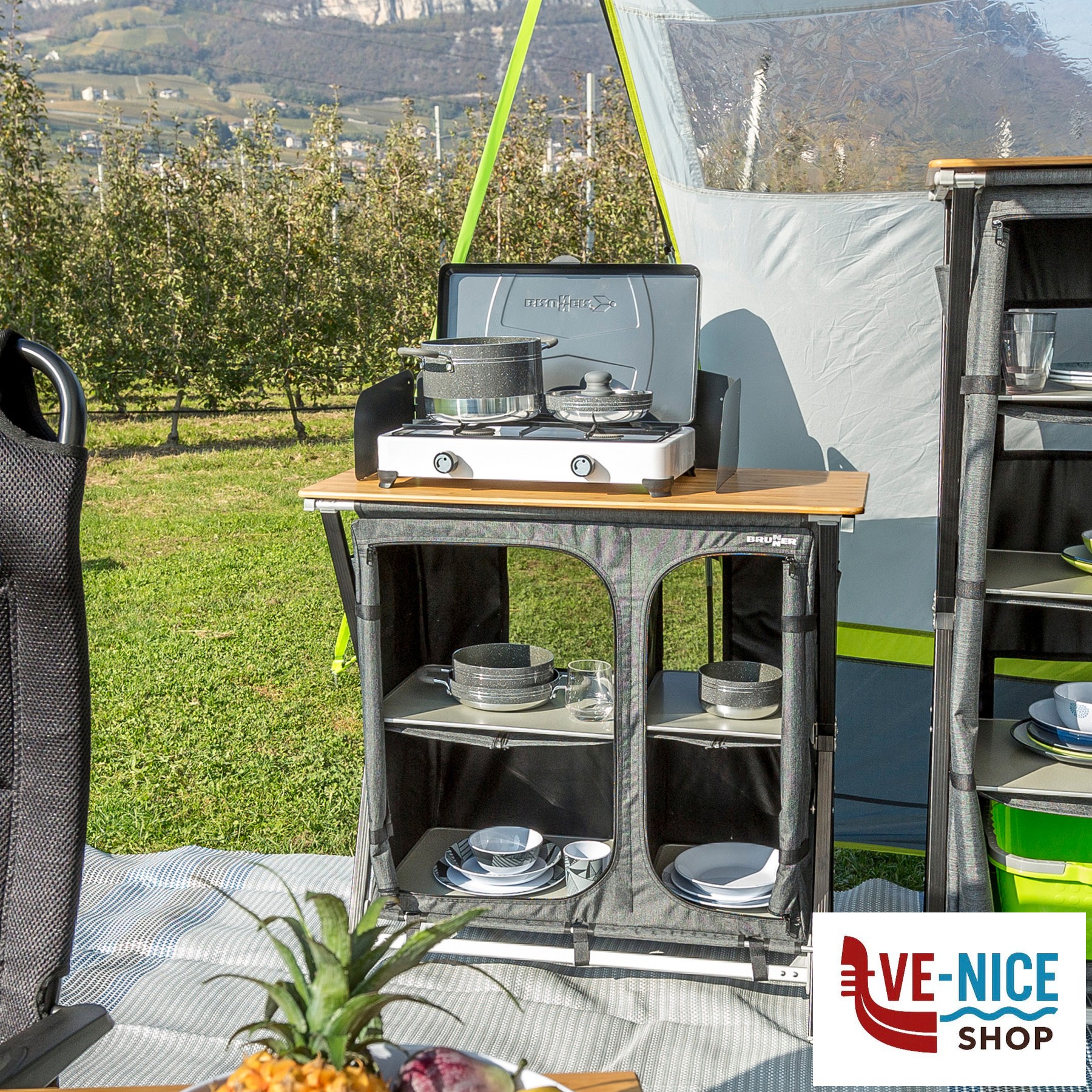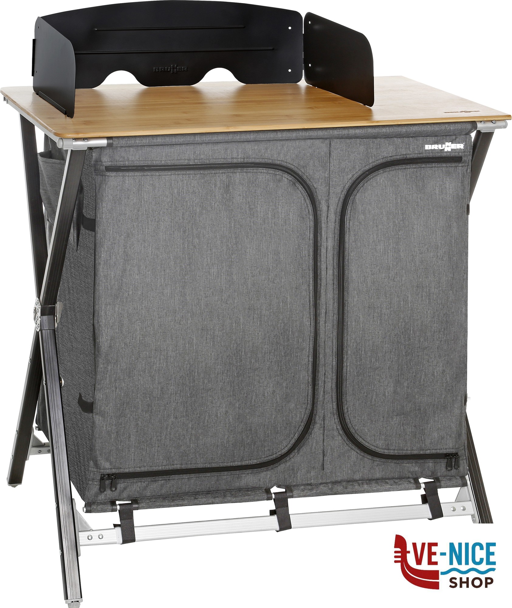 Practical camping kitchen with CROSS frame made of rectangular aluminum profile and central metal hinge. All feet are height-adjustable. With 2 internal shelves and an overhead worktop made from bamboo. Mountless System. Incl. windscreen and carry bag.