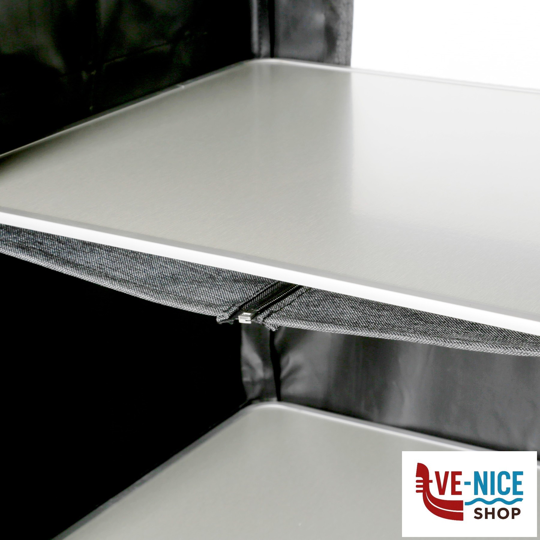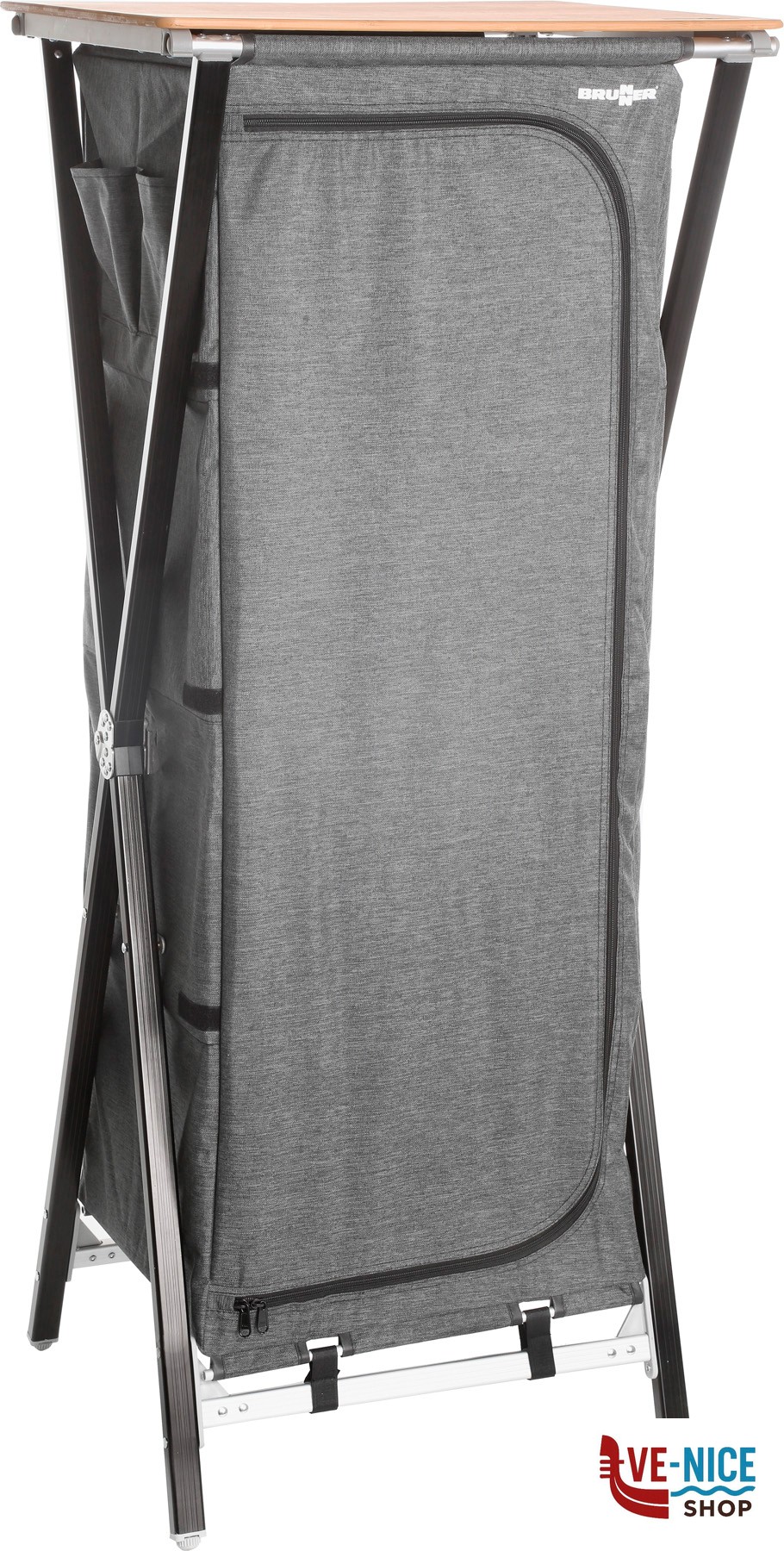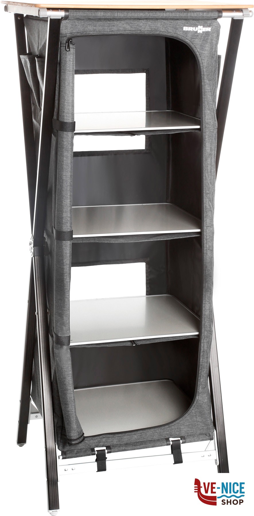 Sturdy multi-purpose cabinet with CROSS frame made of rectangular aluminum profile and central metal hinge. All feet are height-adjustable. With 4 internal shelves and an overhead worktop made from bamboo. Mountless System. Incl. carry bag.