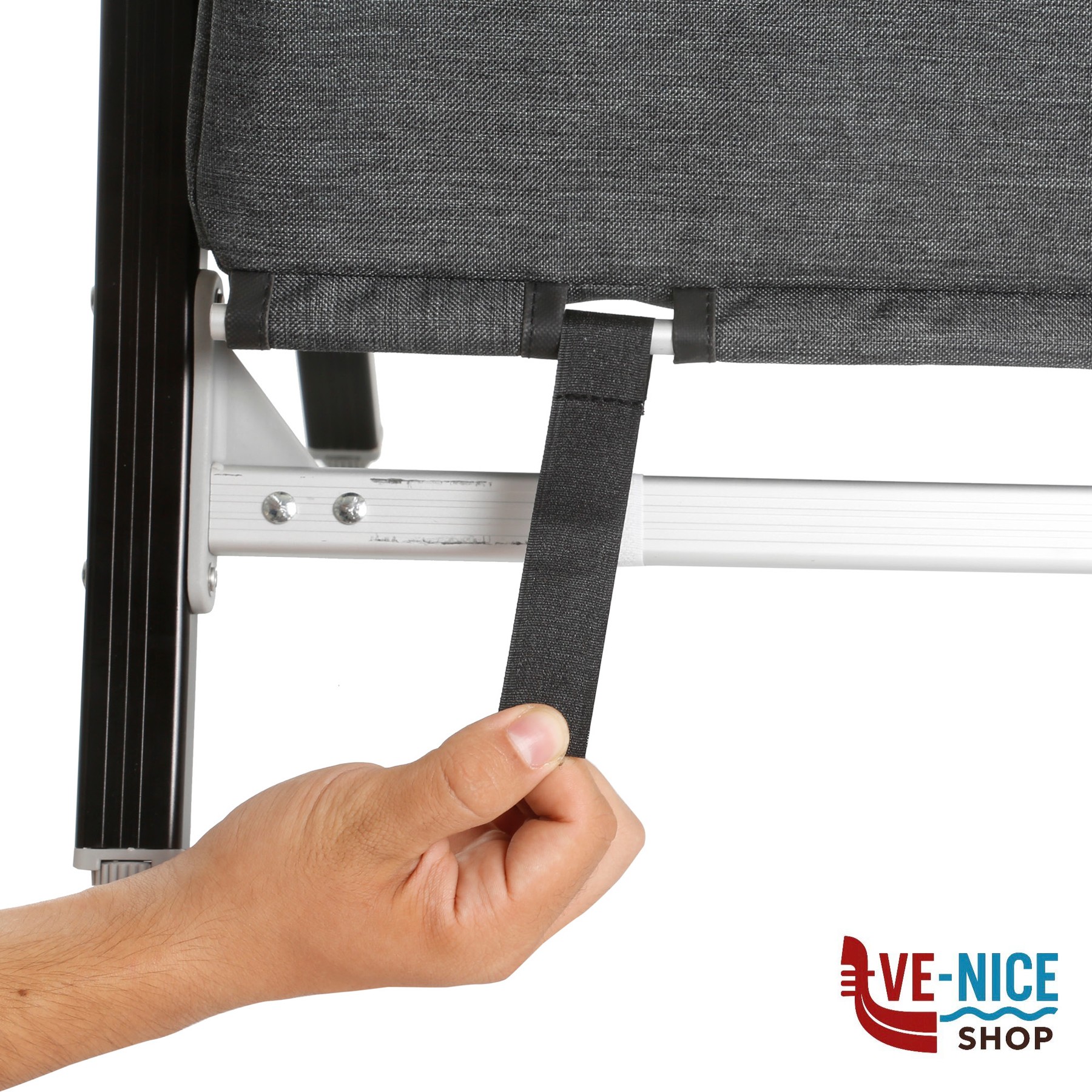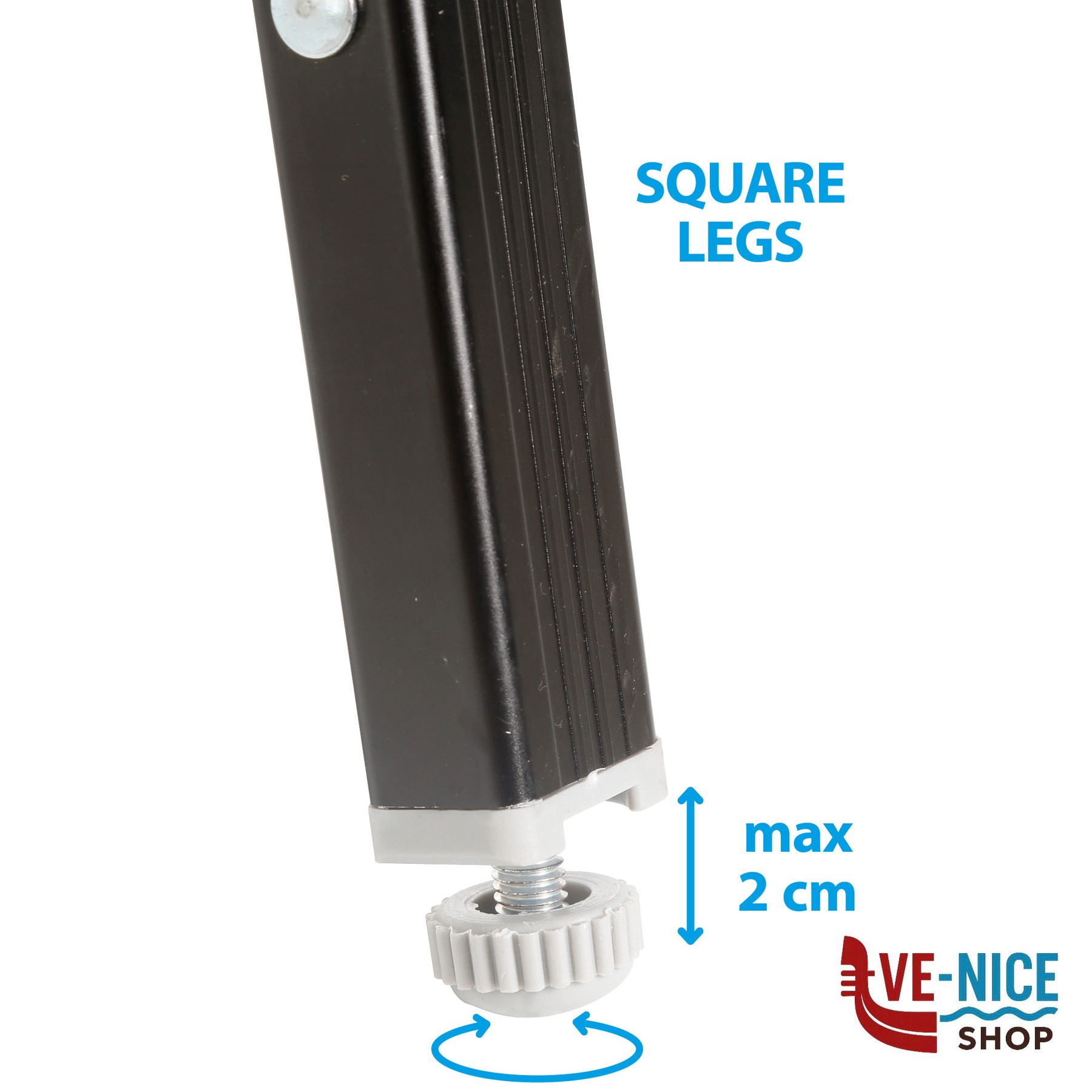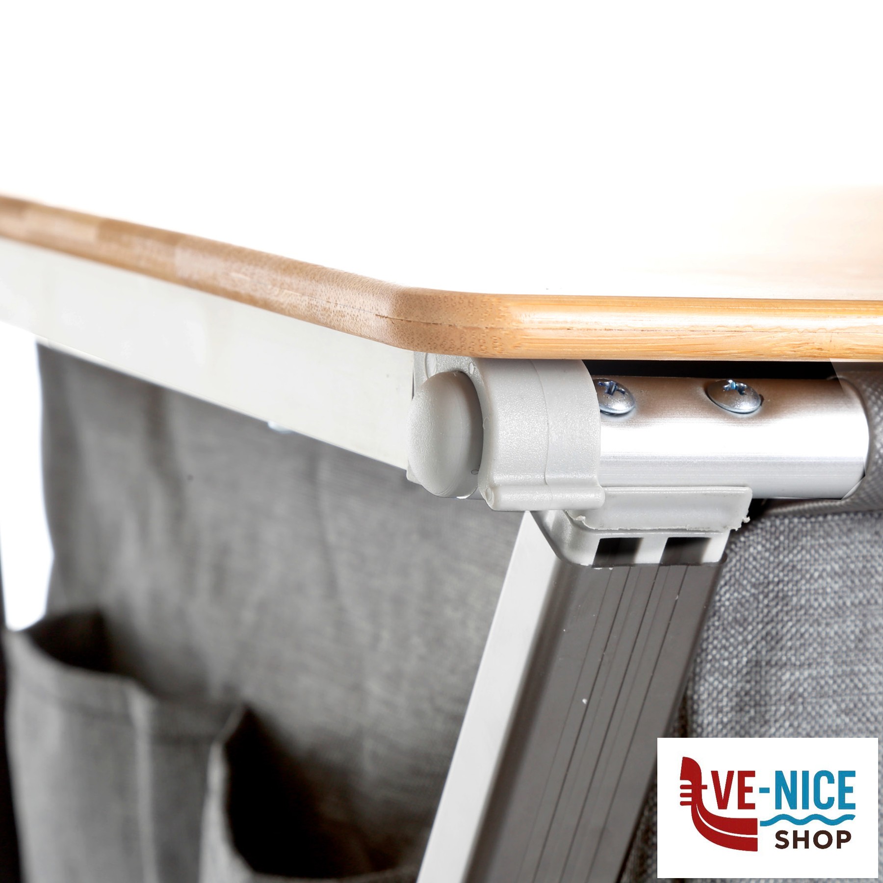 Sturdy multi-purpose cabinet with CROSS frame made of rectangular aluminum profile and central metal hinge. All feet are height-adjustable. With 4 internal shelves and an overhead worktop made from bamboo. Mountless System. Incl. carry bag.