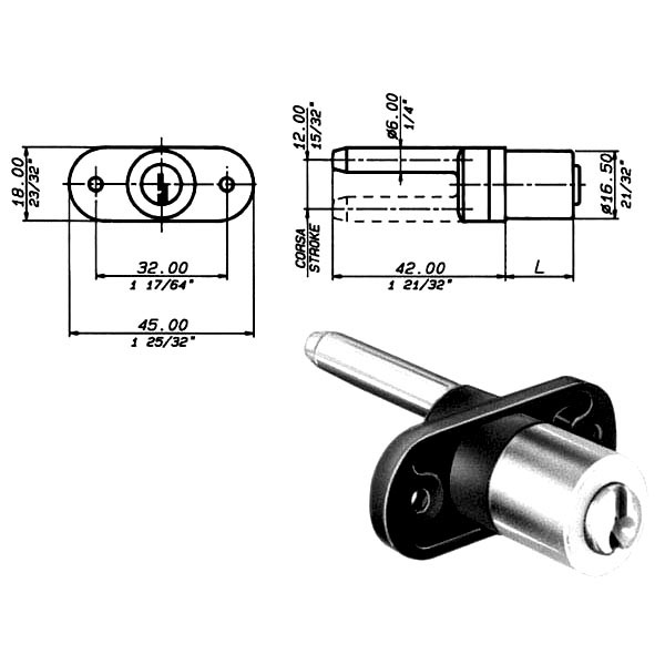 Serratura resina colore nero Applicazione cassettiere – Fissaggio orizzontale 2 uscite chiave – Rotazione 360^ Chiusura multipla con perno Cilindro aspine mm 16,5×21 Dimensioni mm 45×18 spessore conperno 42,0 2 chiavi