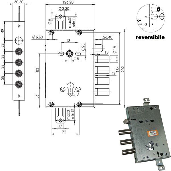 Serratura cilindro europeo a planare triplice Movimento ad ingranaggi Trappola anti effrazione – Fori protettore mm 38 Catenacci laterali 4 pistoni escrocco reversibile Interasse catenacci mm 28 – Sporgenza mm 10,0 Scrocco azionato da maniglia quadro mm 8 e chiave Scatola mm 126x202x30 – Entrata mm 63 Cilindro non incluso