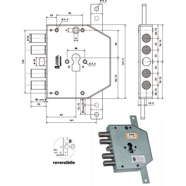 Serratura cilindro europeo a planare triplice Trappola anti effrazione – Fori protettore mm 38 Catenacci laterali 4 pistoni Scrocco centrale reversibile Interasse catenacci mm 25 Scatola mm 137x157x30 – Entrata mm 63 Cilindro non incluso