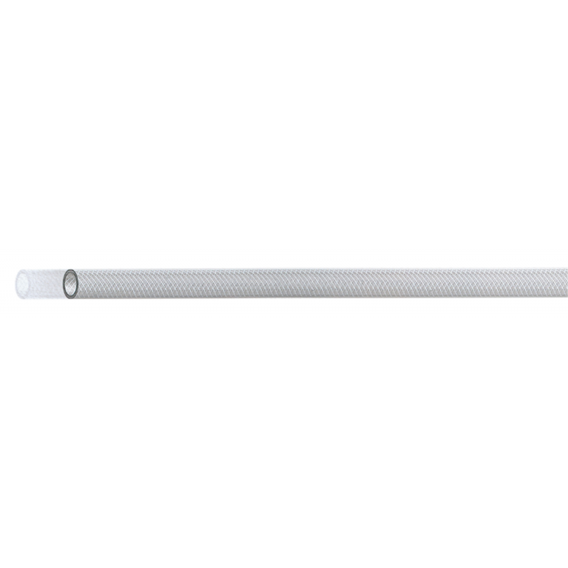 PVC Hose, soft, non toxic polyester braided yarn, transparent. Temperature range -10°C +60°C. Weathering and most chemicals resistant. Application : compressed-air, food liquid according to CE rules. Working pressure: 10 bar.