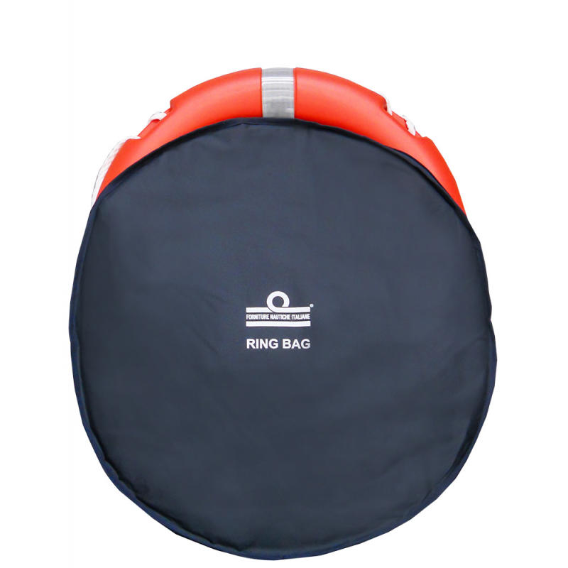 Contenitore in tessuto poliestere imbottito per salvagente anulare (art. 1010004/1010011) o similari. Apertura con cerniera e fissaggio a pulpito e battagliole con velcro regolabile. Può contenere anche la cima regolamentare art. 1010030 e la boetta luminosa art. 1040835