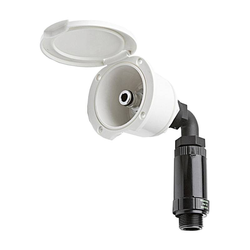 Contenitore con innesto rapido e riduttore di pressione per carico acqua dolce tramite collegamento alla rete idrica della banchina. Completo di contenitore e coperchio in ASA bianco, riduttore di pressione 2,5 bar, curva a gomito con filetto maschio da 3/4 e valvola di non ritorno.