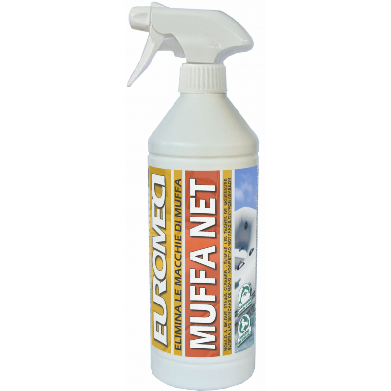 Muffa Net eliminates mold stains from leatherette cushions, rubber dinghies and fiberglass. It is sprayed on the stains and rinsed off as soon as they are gone. Bottle with sprayer. Bottle lt. 0.75. Pack of 12 pcs