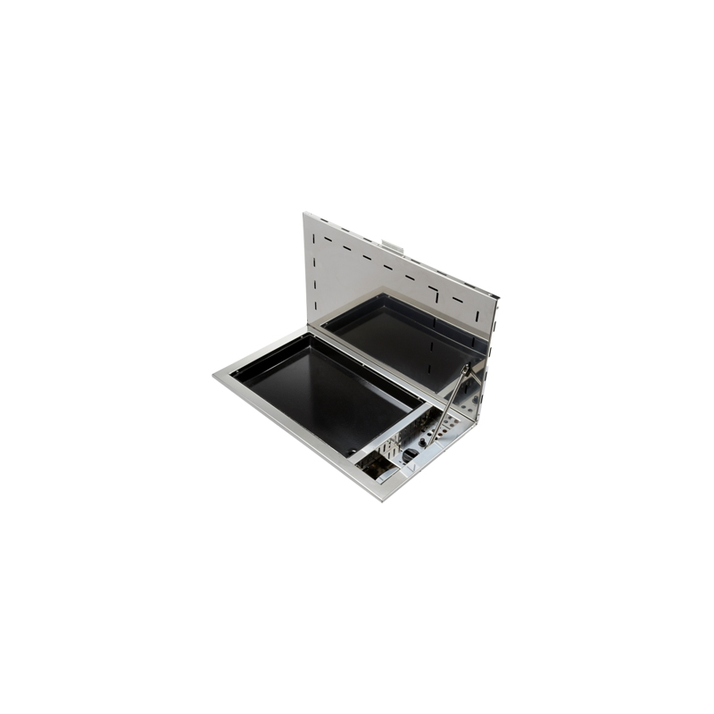 Barbeque ad incasso realizzato in acciaio inox con piastra in ghisa smaltata, coperchio extrapiatto e sifone raccogli grasso. Accensione a gas, con termocoppia di sicurezza.