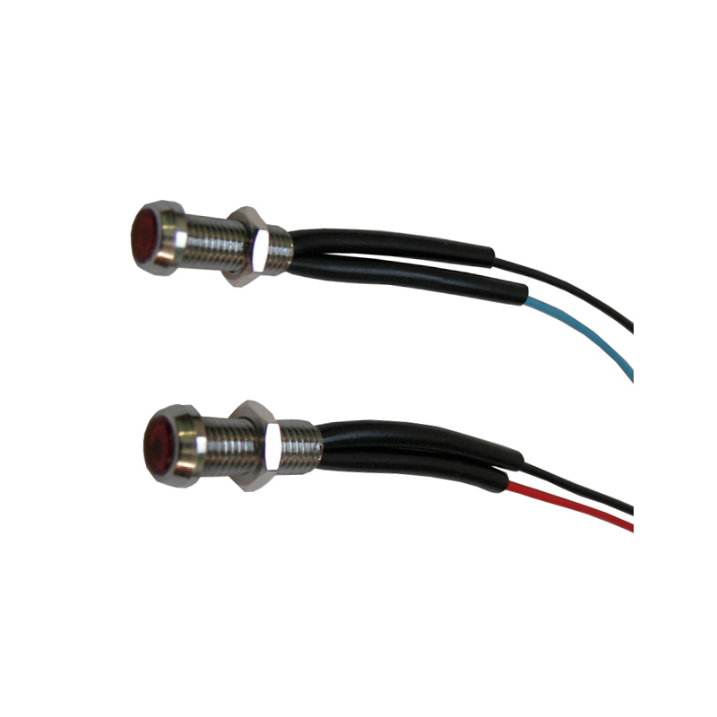 Red led signal lamp built in chromed brass, lens in polycarbonate. Nut fastening. Bore Ø mm. 6, cable mm. 250. Black wire + blue wire –