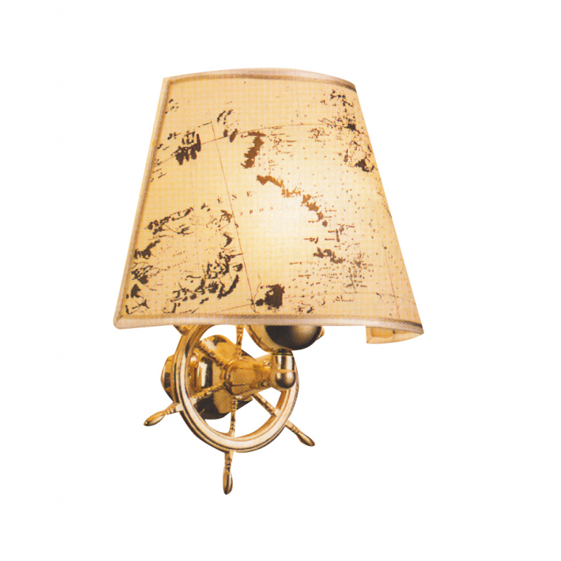 Lampada elettrica con timone in ottone, completa di paralume in pergamena stampata, fisaggio a parete.