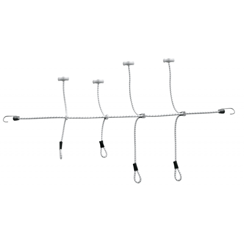 Millepiedi in nylon e ganci inox, con varie diramazioni per fissare le vele sulboma o il fiocco a prua. Treccia elastica Ø mm. 8.