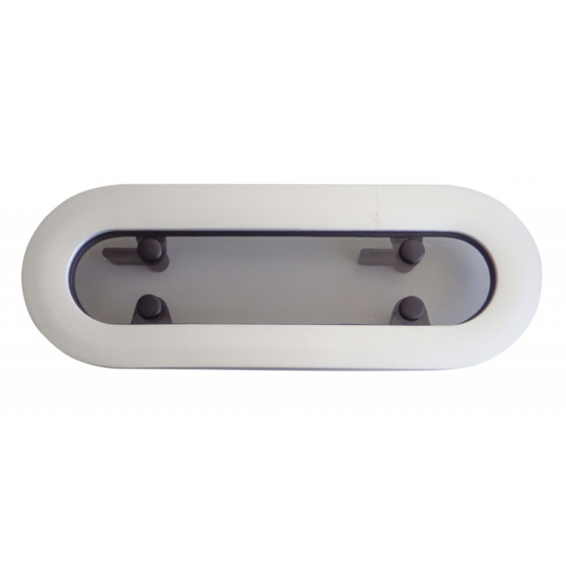 Oblò semiellittico apribile in lega leggera anodizzata, con cerniera a frizione per bloccare lapertura nella posizione desiderata. Metacrilato da mm. 10, Dim. taglio mm. 390×130