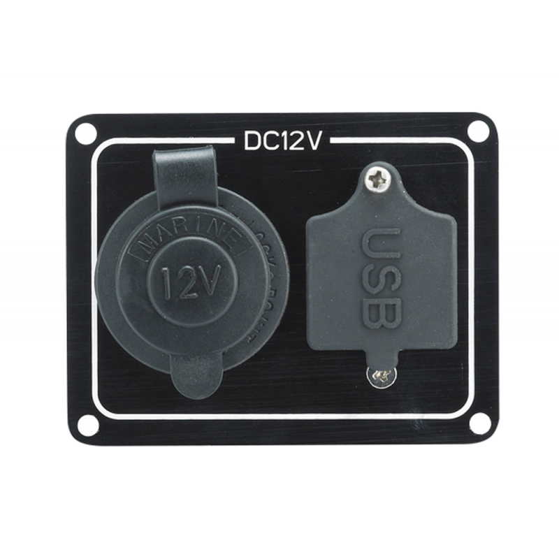 Pannello in alluminio nero stagno IP65 con presa accendisigari a 12 vdc e alimentatore usb da 5 vdc. Dim. mm. 81×62. Dim. prese accendisigariØ interno mm. 21, profondità contatto mm. 39.