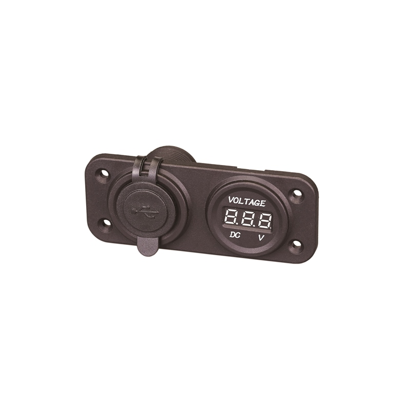 Panelin PVC plastic with double USB output and volmeter indicator for thebattery condition. Protective cap for USB sockets.