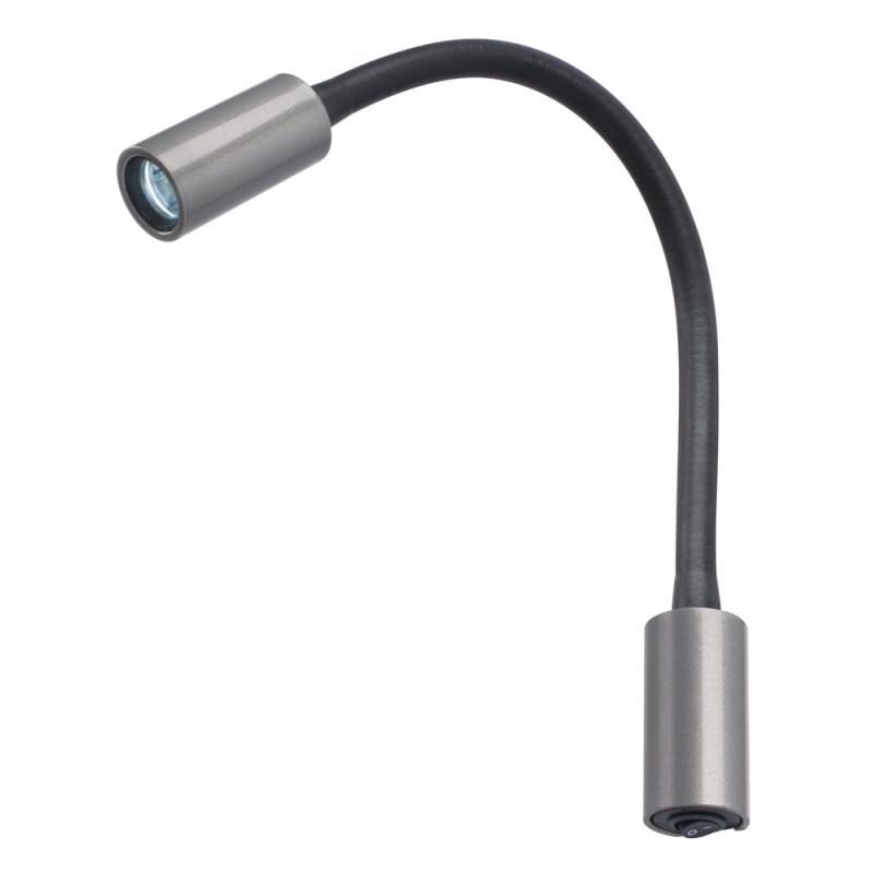 Luce da lettura flessibile, stagna IP 40 a 1 POWER LED ( 75 LUMEN ), corpo in allumunio grigio, base e testa in plastica cromata con interruttore alla base.Luce bianca naturale. Sensibile alla polarità.