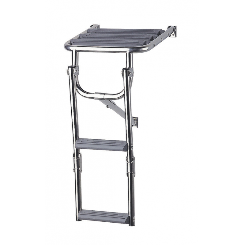 Plancetta di poppa in PVC con scalettapieghevole ribaltabile in acciaio inox e PVC grigioantiscivolo, gradini larghi mm. 70 per una maggiorestabilità e comfort.