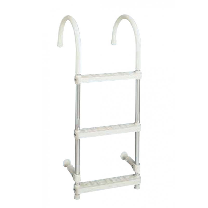 Scaletta in tubo di alluminio anodizzato, gradini in plastica. Attacchi curvi mm. 260 e pieghevoli all’interno ricoperti da una guaina in plastica, distanziatori regolabili.