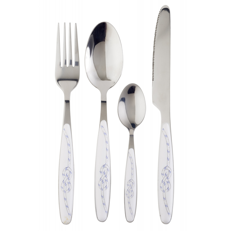 Set per 6 persone di posate in acciaio inox e ABS lavabili in lavastoviglie composto da n. 24 pezzi totali: n. 6 cucchiai, n. 6 forchette, n. 6 coltelli, n. 6 cucchiaini da caffé.