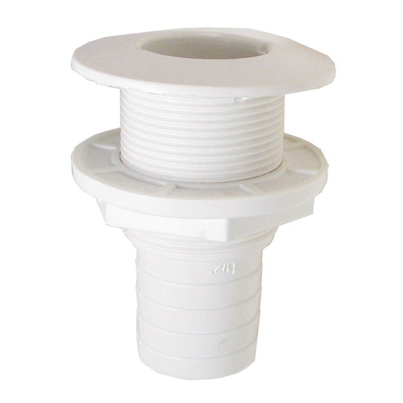 White nylon threaded through hull with hose connection and ferrule.