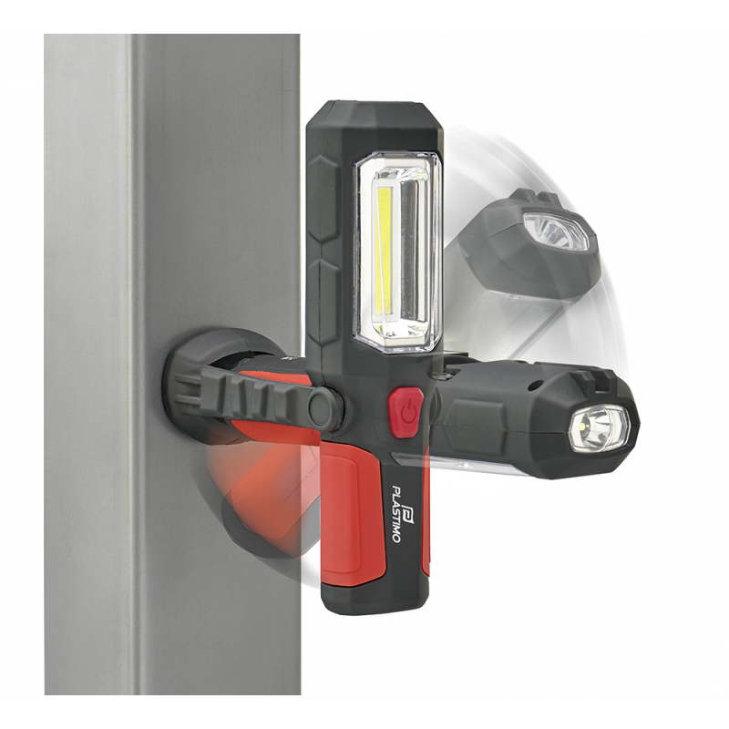 Work light support of the magnetic inclination to stabilize and incline the light. Suspension hook to hang it on various supports. Magnet on the back to anchor it to metal parts. 200 lumens brightness for a maximum indicative visibility of 30 mt. Weight of 170g without batteries.IPx3 water protection. Methods of use: 1) Torch 2) Spot