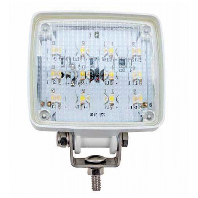 Proiettore stagno IP67 in lega leggera, colore bianco a 12 LED.Staffa in acciaio inox snodata e orientabile. Alim. 9-36V 13W.Potenza luminosa 1260 lumens. Dim. mm. 110x100x44 prof.Peso kg. 0,5