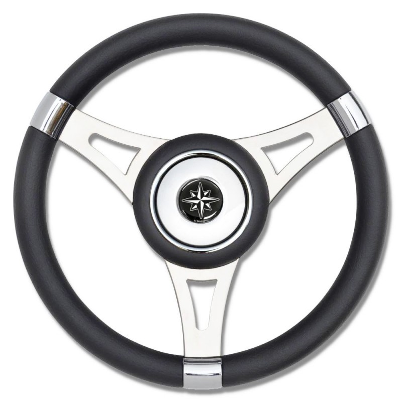 Steering wheel 3-spoke stainless steel mirror polished. Steel hub, genuine leather cover with wind rose logo in the middle. Soft polyurethane grip. 7 ° inclination.
