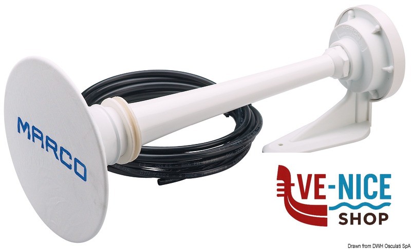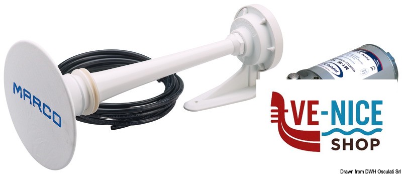 Avvisatori acustici Trombe da appoggio e megafoni Tromba MARCO in ottone con compressore Omologate RINA. per imbarcazioni da diporto oltre 12 m e imbarcazioni da lavoro (pescherecci o simili) da 12 a 20 m. Complete di compressore e accessori per il montaggio.