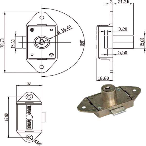 Serratura metallo pressofuso nichelato Applicazione antine 2 uscite chiave – Rotazione 180^ Chiusura aste rotanti – Mandata mm 7,5 Cilindro a spine mm 16,4 Dimensioni mm 32×78,70 spessore 16,6 lunghezza 22 2 chiavi Fornita senza aste e accessori fissaggio