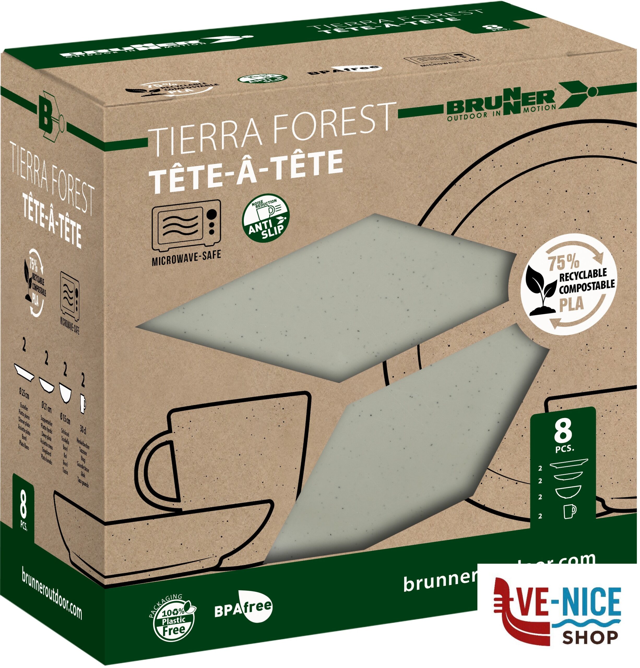 Pezzi~8!!!Piatto fondo~2 x Ø 21 cm!!!Piatto piano~2 x Ø 25 cm!!!Scodella~2 x Ø 15 cm!!!Tazza~2 x 30 cl – Ø 9 x H10 cm