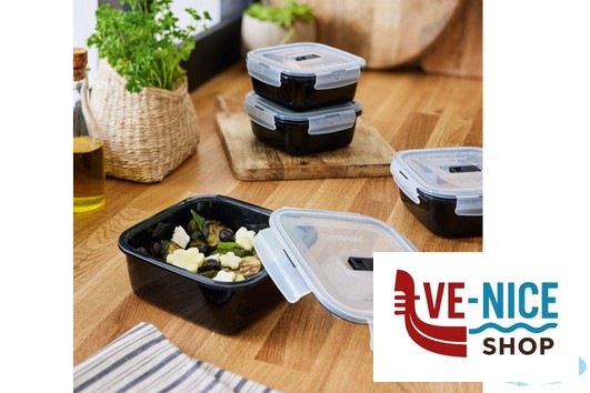 PRATICO CONTENITORE IN VETRO TEMPERATO DI COLORE NERO DOTATO DI COPERCHIO A TENUTA STAGNA IN PLASTICA