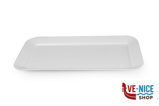 VASSOIO IN PLASTICA BIANCO DI FORMA RETTANGOLARE IMPIEGATO PER L’ALLESTIMENTO DI SUPERMERCATI NELLA ZONA MACELLERIA E SALUMERIA