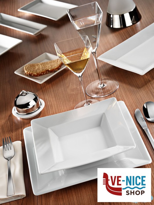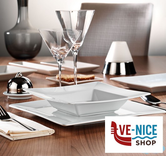 LE FORME SQUADRATE VAGAMENTE ORIENTALI DISTINGUONO QUESTA COLLEZIONE DI PORCELLANA BIANCA. AMPIA LA FALDA PER LE DECORAZIONI SUL BORDO, PORCELLANA SOTTILE E SONORA.