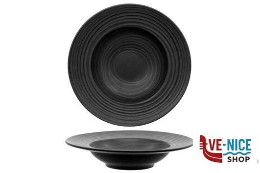MODERNA COLLEZIONE IN STONEWARE NERO ARRICCHITA DA UN DECORO REATTIVO CONCENTRICO TON SUR TON. OGNI PEZZO E’ UNICO E DIVERSO DAGLI ALTRI.